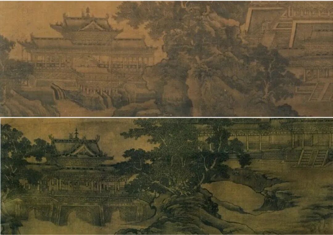 图7 《明皇避暑宫图》(上)与《汉苑图》(下)水榭对比