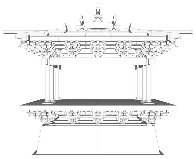 虽然关于中国唐宋元时期单体建筑如何确定柱网尺寸,用“份”还是用“尺”,学术界尚无定论,但是中国古代匠人在确定大殿尺度时,“往往采用柱头平面作为基本尺度量取位置”。而与柱头平面关系最密切的,是铺作的布置,《营造法式》也是通过铺作层的布置来对殿阁的平面进行区分的。因而,铺作似乎可以成为复原研究的起点。这也正好契合了中国传统建筑“以材为祖”,通过斗栱控制单体设计的原则。并且,在皇家建筑端庄整齐的要求下,铺作的分布一般比较均匀,那么攒档(铺作间距)甚至可以作为一个放大模数参与平面的设计。这样,结合铺作形式和攒档,可以推算出一个对整座建筑具有控制意味的基本参考平面,再通过对建筑结构方式的讨论,便可以得知底层柱网的分布情况。而参考平面通过折屋之法又可以直接决定屋顶的曲线,两相结合,一座建筑的控制性尺寸便可以被推算出来。从这一点考量,画作就体现了它独特的优势:《明皇避暑宫图》对每一座建筑的铺作都做了“至详至悉”的刻画,铺作的数量和形制都交代得很明确,特别是最上一层铺作分布均匀、比例协调,应该是“折算”之后的结果。而铺作形式,也正是上述复原方法中步骤五、六、七力图达成的结果。