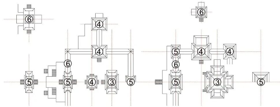 表1中有一组数据值得注意:若以125份的标准攒档计,四、五、六等材换算后的尺寸刚好为6尺、5.5尺和5尺,尺数规整并且相邻等级之间存在0.5尺的级差,不难看出,四、五、六等材属于关联密切的一组材等。《营造法式》规定“殿三间、厅堂五间”用四等材。《明皇避暑宫图》中出现的建筑多为三开间,部分楼阁建筑除两侧耳房之外的主体部分也是三开间,由此不妨假设《明皇避暑宫图》中的建筑或应以四等材为主。同时《营造法式》也规定,“殿小三间、厅堂大三间”用五等材,“亭榭、小厅堂”用六等材。因而,在针对《明皇避暑宫图》的复原研究中,可以推测殿堂使用四等材,门殿使用五等材,廊子、亭榭使用六等材(图5),三个材等下的攒档都取125份。