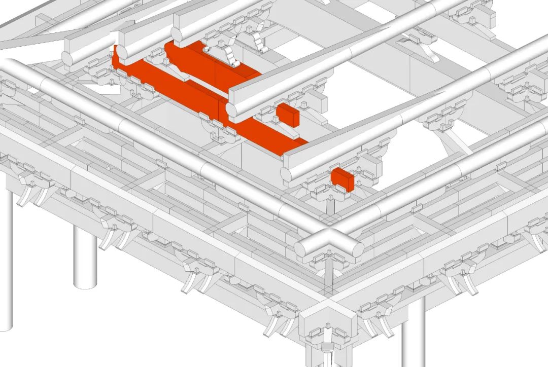 水榭擗帘竿的细节证明了细分网格的存在。右侧余屋前檐的擗帘竿与檐柱的对位关系相对明确,但是后檐下二者的关系就比较凌乱了。对于一个能设计出如此复杂宫殿的画家来说,不应该犯这样常识性的错误。可是如果用上面分析的网格来检查的话,就会发现这些凌乱的擎檐柱又都落在了参考网格控制线上(图35)。