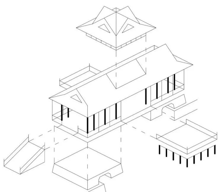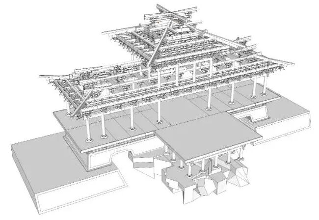 水榭的形制很明晰,在十字脊的统领下,左右各三间,端头做歇山处理,前后露台,两侧胡梯上下(图8)。下文将就殿身、屋顶、台基三个层面分别展开复原研究。