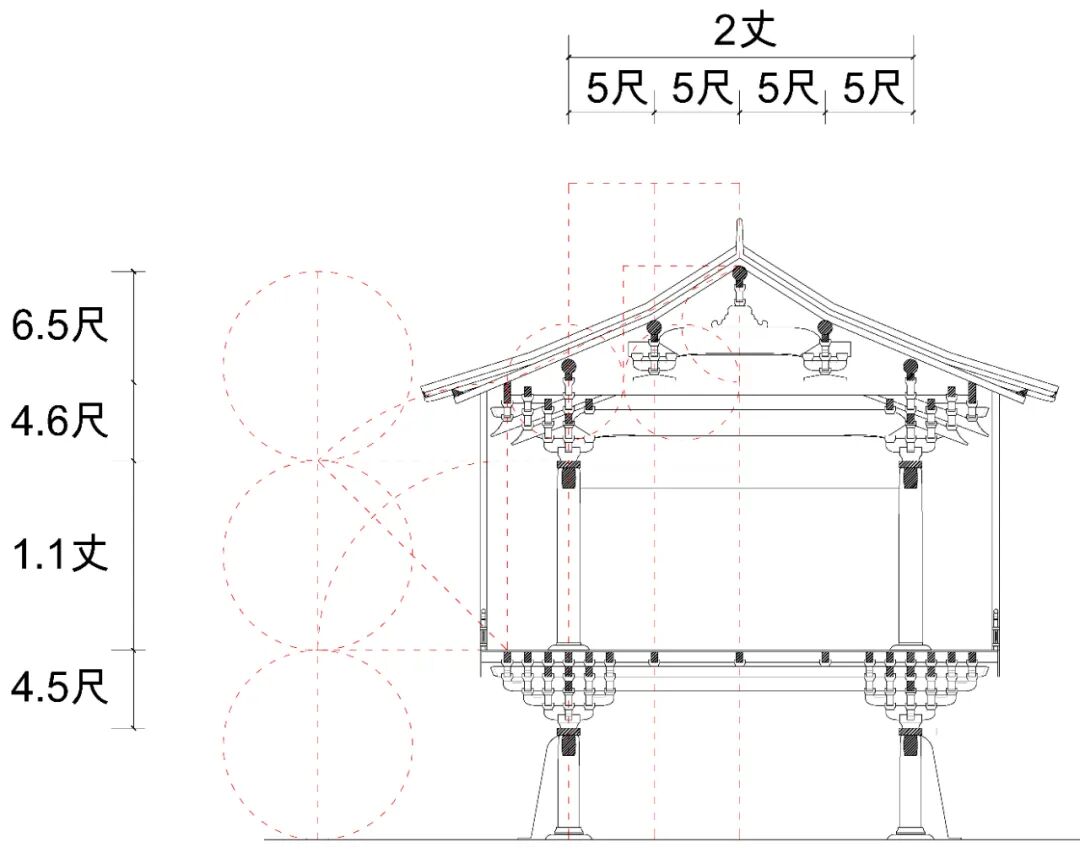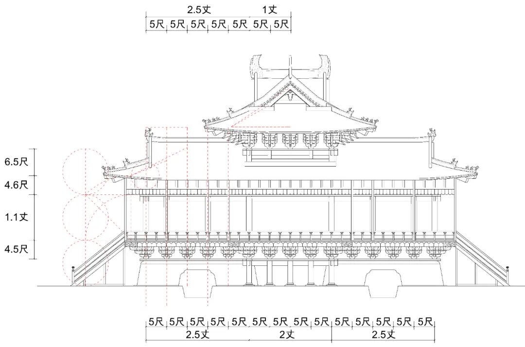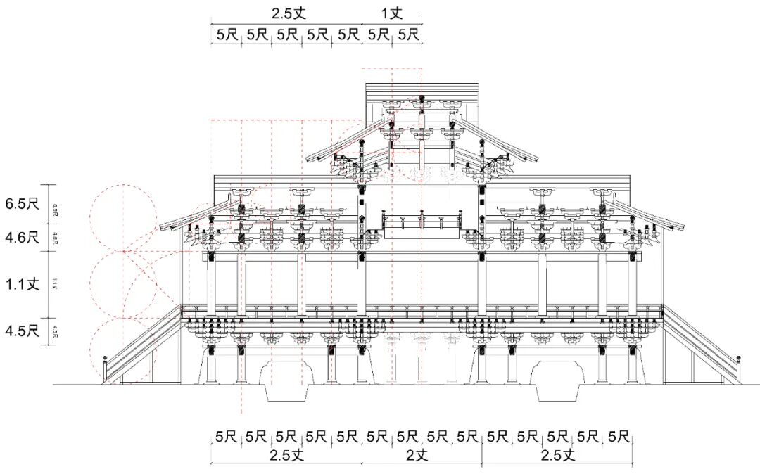清华大学王贵祥教授总结出唐宋建筑柱檐中存在着2倍关系,即铺作高度(辽宋建筑需加上普拍枋的高度)大约为檐柱高度的0.414倍,这一规律可能运用在当心间立面、单体建筑平面,甚至院落组群平面的长宽比例上。