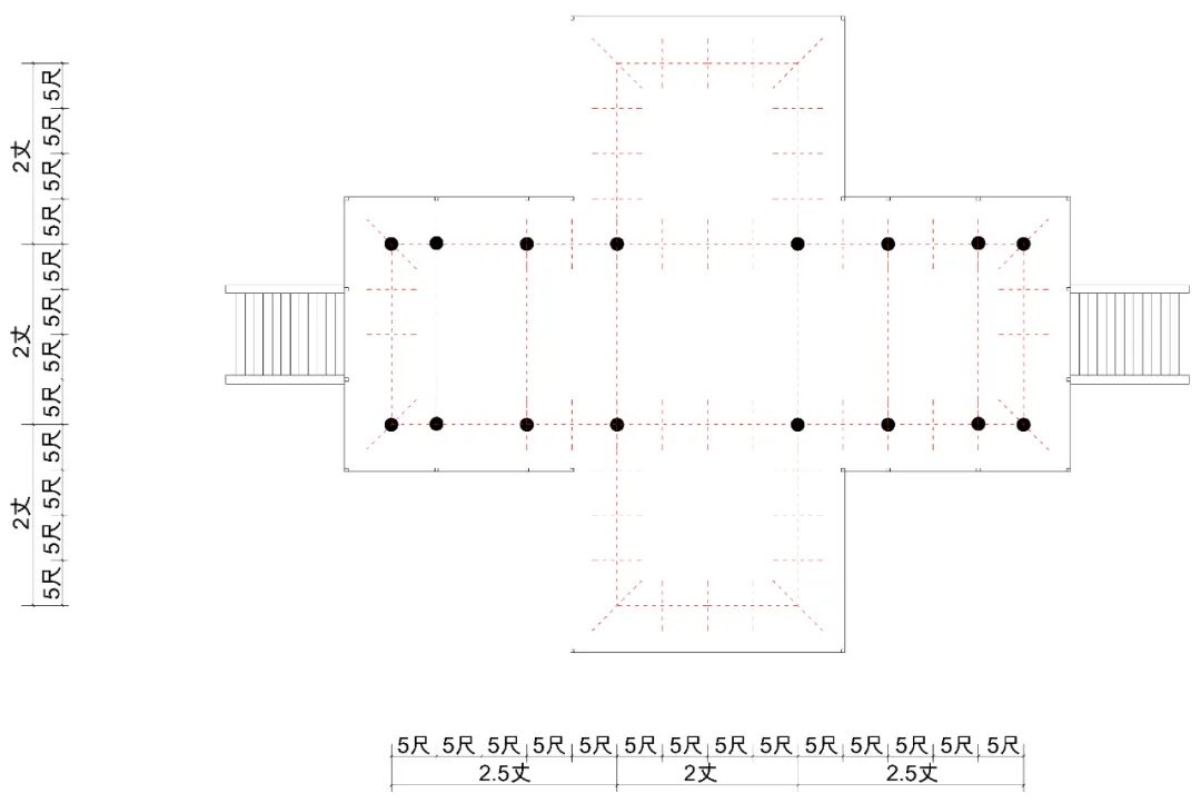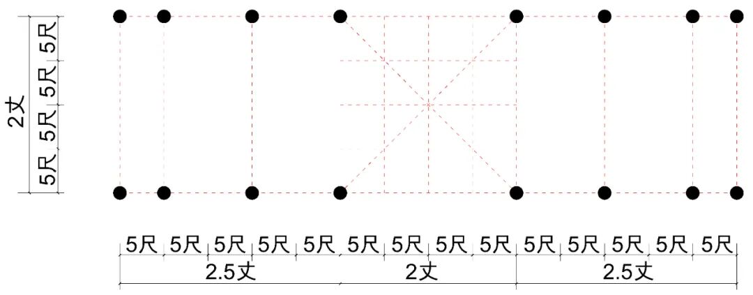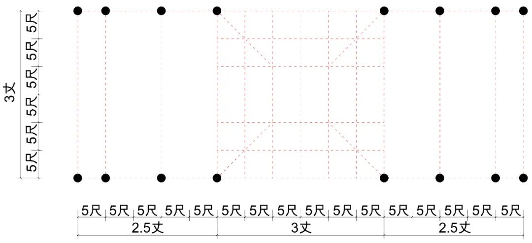 比如上述图9或许并不合理,3丈的开间过于巨大,与画面舒展的比例关系也并不契合。考虑到水榭前方的露台面阔4个攒档合2丈,并且两侧角柱似乎与十字脊下檐柱对齐,所以试着将十字脊的面阔也设为2丈,两侧的尺寸依照画面显示不变,得出的平面如下图所示(图16)。