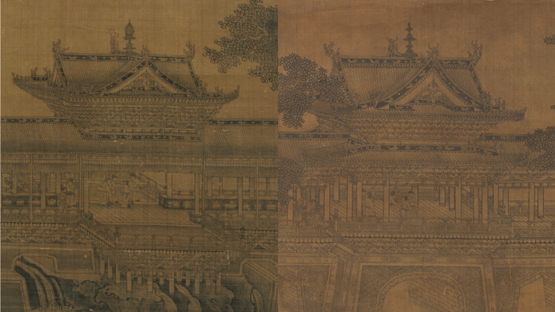 本文选取《明皇避暑宫图》(图1)作为研究对象,相传此图出自五代至北宋初期的画师郭忠恕之手,该画横105.6厘米、纵161.5厘米,为绢本墨笔画。画中宫室建筑宏伟壮丽、结构复杂、细密精工、造型准确、法度严谨,是现存界画中的精品,也是开展界画复原研究的理想素材。