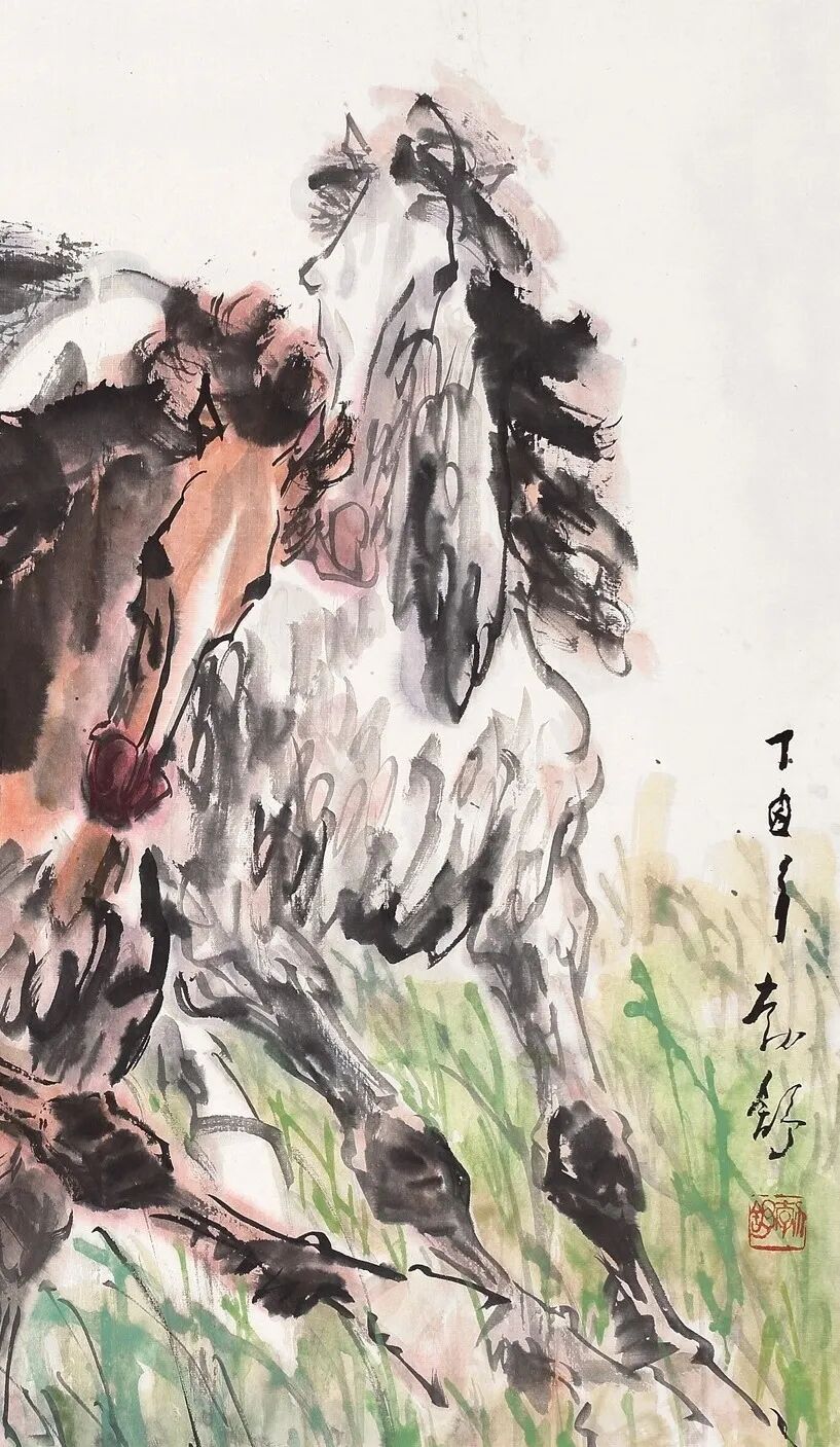 其一,造型处理上趋向于“表现性”与“视觉张力”,一些作品甚至还带有某种宣泄的意味。我们知道,包括《套马》与《大青山上的骑兵》《下乡》《人欢畜旺年丰》中的“马”,都属于一种“现实主义”创作,强调对客观物体的描绘,画面讲究严谨、精细的造型以及对马体结构特性的把握。同时,运用乃师徐悲鸿先生的绘画技法,强调“笔墨勾勒”与“色彩平涂”,描绘“现实之马”。而刘勃舒80年代的“马”却有着明显的“自我”、“随性”甚至“桀骜不羁”的表现。如1983年创作的《踏歌前行》《奋蹄》《悠》等作品中,所流露出来的那种艺术家创作时“酣畅淋漓”之意蕴。在《踏歌前行》《奋蹄》中,马体部分甚至运用了松树的皴法,但其想传递的绝非马的肌肉质感,而是一种“态度”抑或“情绪”;在作品《悠》中,无论是马体还是背景中的花、草等,皆呈现出“笔走龙蛇”的豪姿,一反现实主义创作手法,突出画面的视觉表现力,并在此过程中将艺术家积蓄于胸的情绪顺势宣泄而出。在构图上,也撇开“平稳方正”,而取“险峻奇崛”,正所谓“西风吹来‘马蹄疾’”,我想这与85思潮前后的整体艺术氛围不无关系……再如《良驹》(1988年)《天山牧歌》(1990年)《雄姿》(1990年)等创作,更是脱落其形式,追求其强烈的表现性。实质上,我们亦能从中体会并感受到20世纪80年代成长起来的一代艺术家所身处的“时代语境”与“内在交集”。