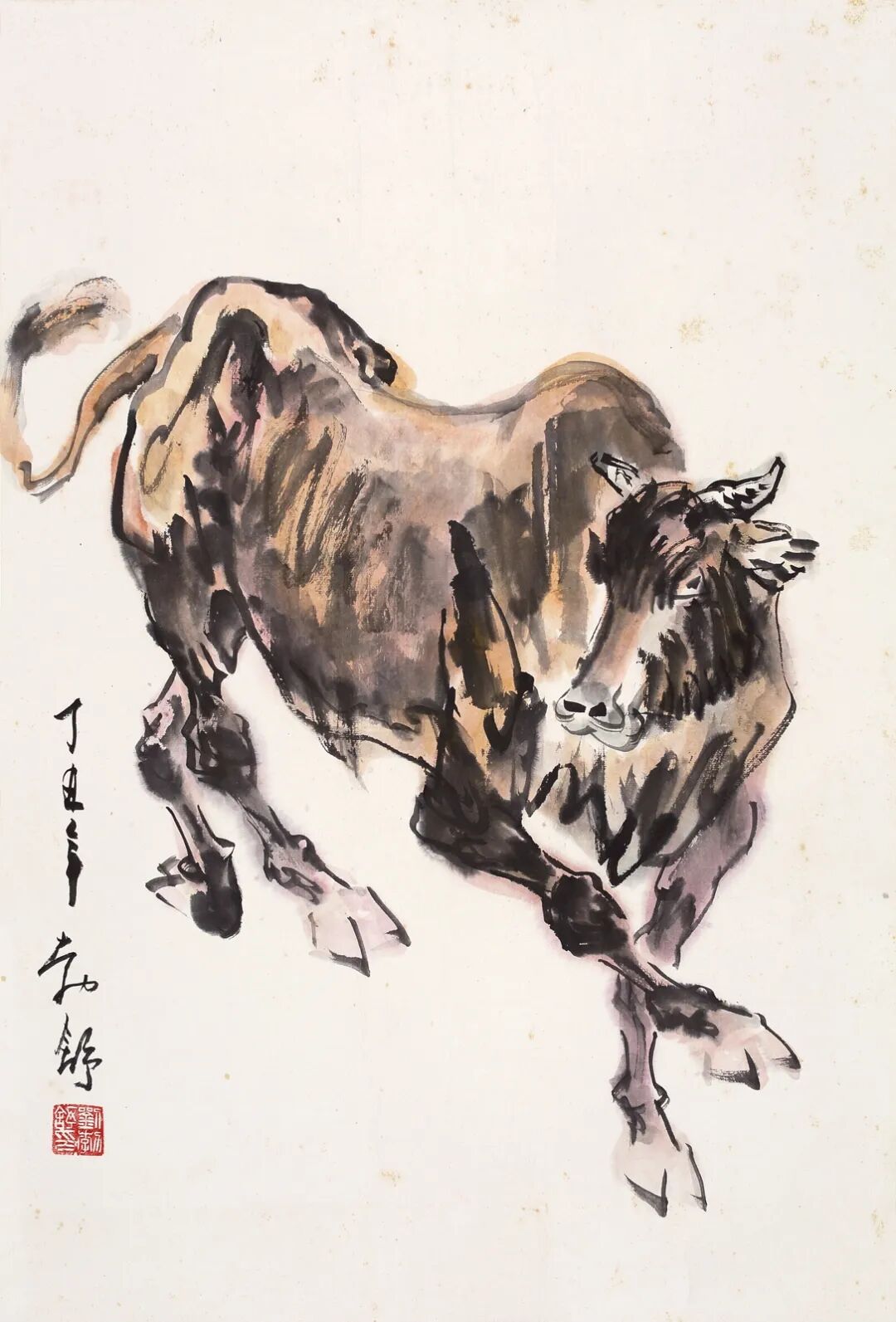 其三,心向传统,着力于“笔墨”语言的传承与发展。在诸如李斛、杨之光、刘勃舒等徐悲鸿的中国画弟子中,都有一个突出的特点——即扎实的笔墨功底与严谨的造型能力“双管齐下”。改革开放以来,在诸多思潮此消彼长之际,刘勃舒的绘画也充分展现了以一种宽阔的视野与格局去拥抱各种绘画变革思潮的倾向,但同时,他对“传统”的坚守亦一以贯之。这一方面与他个人的艺术理念相关,另一方面我想也与八十年代中后期西化过程中所兴起的回归传统思潮有某种关联。我们知道,正是在85新潮美术泛滥之际,诸如“新文人画”口号的提出及创作群体的出现等反拨现象应声而出。1989年《美术研究》发表了郎绍君《重建中国的精英艺术》一文,在某种程度上也是基于当时艺术情境的一种直观反思。显然,刘勃舒在其关于艺术“变与不变”的考量中,笔墨属于后者,也是其审美诉求的核心之一。如《老牛》(1997年)、《虎跃纵横》(1998年)中借助笔墨语言对老牛、猛虎形体的塑造;《三马图》(1985年)中的中锋行笔,如锥画沙的笔墨功力及悠远绵长的意境表达;《师为古之伯乐所不及》(1998年)中对古法用笔的神韵之追;《偶得佳作》(1991年)中的雄鸡,《勃舒练笔》(2002年)中的松树、松鼠等“意趣情调”的表现等等。可见,刘勃舒在各种艺术思潮喧嚣的语境中,有着清醒的坚守与明确的立场。
