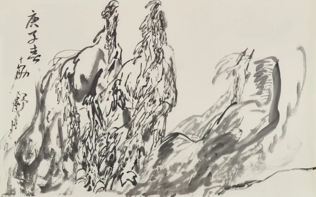 其二,“向内观,画自己”。在笔者看来,此阶段的“马”,似乎才是真正成为极具个体风格特征的“勃舒马”。当然,所谓“勃舒马”一方面体现在结构、造型、语言上有刘勃舒自己的独特之味道;另一方面也是更重要一点,即“勃舒马”开始向内观,画自己(勃舒)。已经有很多学者、批评家认为,晚年刘勃舒的马就是在画他自己——精神上的“斗志昂扬”与形体上的“瘦骨嶙峋”并存,可谓一语双关。我想,这或许与晚年黄宾虹的“浑厚华滋”有异曲同工之妙,艺术家已经脱离了物质层面的奢求,转向精神层面的追问。刘勃舒对于艺术语言的发展,社会变革的洞察,都已融入到自身的日常性的“呼吸”之中,平淡无奇且重要异常。因此,他的作品所呈现出来的更多是一种“个人化的内省”,而打动观者的,也并非于技术、观念层面,而是其“精神之维”。由此,我们可以看到晚年的刘勃舒,逐步表达出一种“从心所欲不逾矩”的姿态,一种对自我艺术历程乃至生命体验的反思之旅。一如他2000年《独马》中对孤独的体悟、感受的传递;2013年《峥嵘千里志》中对过往流逝岁月的缅怀与追忆;2012年《自在》中,对身心自由的感怀与向往——“在场的是马,不在场的是艺术家本人”。