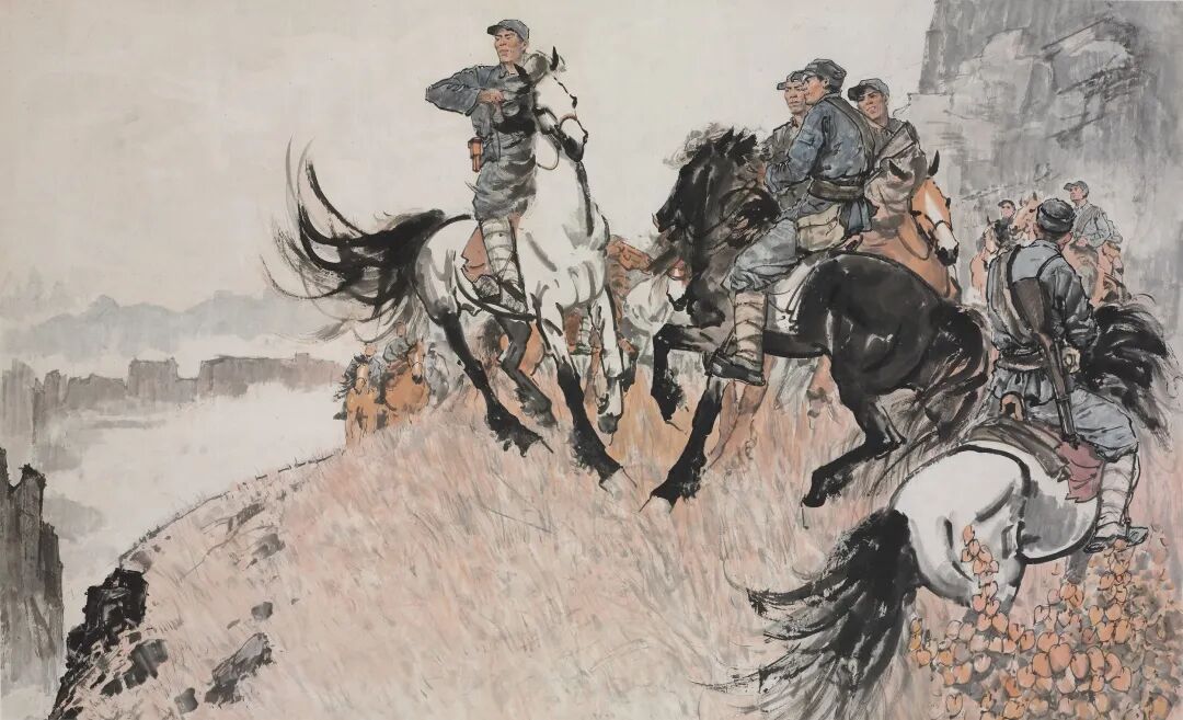 这一点在刘勃舒早期创作中可见端倪。如1959年的《大青山上的骑兵》,刘勃舒熟练地采取了徐悲鸿典型的“笔墨勾勒”与“色彩平涂”相结合的艺术语言。在对战士、马匹以及山石植被进行造型严谨描绘的同时,保留了传统中国画的笔墨意味。值得探讨的是,画面明显拒绝了“全因素素描”的困扰,在注重运用色彩平涂营造氛围的同时,又避免了将作品进行平面化、装饰性的处理,反而更具立体、直观的面貌。突显了人、马、景之间相融共生的时代气象。在《采集民歌》中,刘勃舒将不同年龄、性别、身份以及不同姿态的人物特征生动地刻画了出来,尤其注重对人物结体的准确把握。整幅画面突出了对新中国欣欣向荣时代气象的表现。语言方面,则仍然运用“乃师乃法”,这不仅体现在少数民族壮汉身上的褐色,姑娘们身上的蓝色与紫色,还体现在对茫茫然的绿色大地的“平涂”上……尤其值得一提的是刘勃舒的《套马》,将徐悲鸿先生大多侧重于“单马”或数匹马的创作进一步发挥为“群马”,整幅画面气势撼人,干净利落,反映了青年时期的刘勃舒对于“宏大历史场景”整体把控的能力 1 ……我们至今仍能从这些作品上感受到迎面扑来的那种带有历史感的生活气息。2