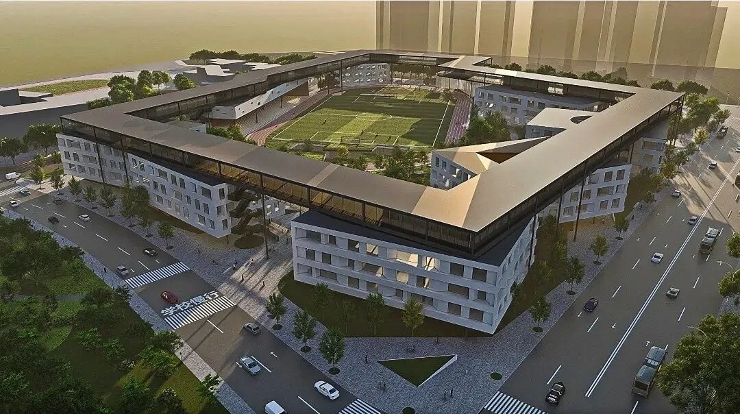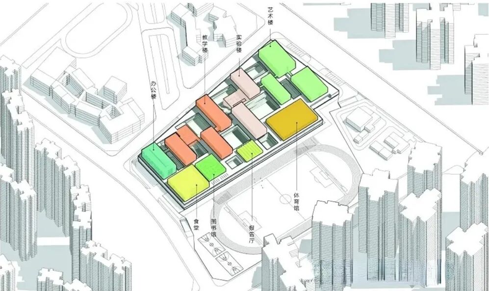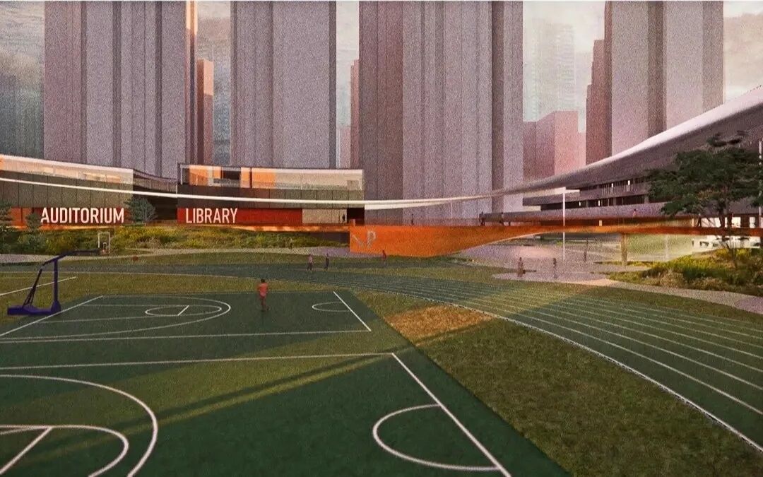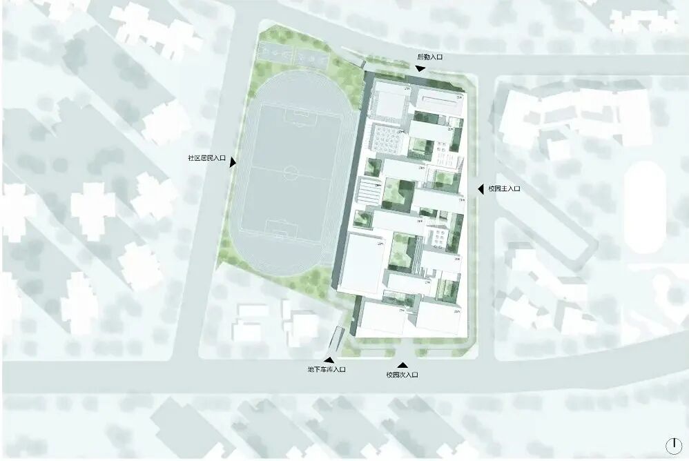 广州长物建筑设计方案将校内运动场、停车场、体育馆、多功能厅等空间沿运动场独立布局,设立专门的居民共享出入口,规避了流线冲突。