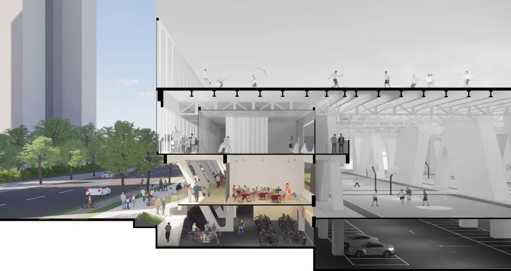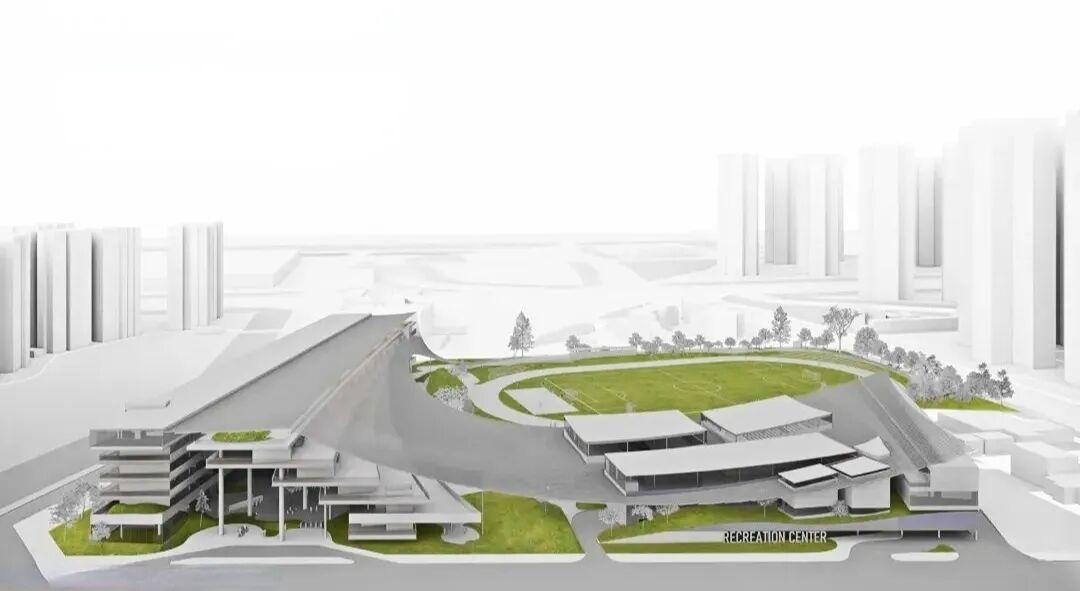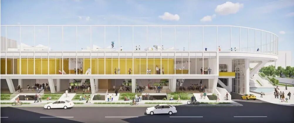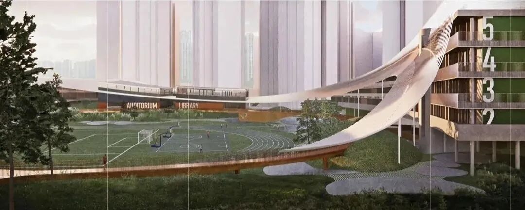 华南理工大学参赛方案通过抬升操场高度,把临街空间让渡给城市作为社区中心、托管服务中心及商业服务用房,居民可在这里遮阳避雨、休闲娱乐,形成一道展现城市人文色彩的风景线。
