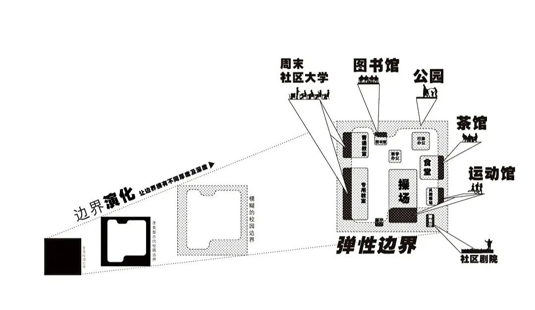 方案为了满足老师、学生、居民的不同需求,提出了“弹性边界”的概念,用“市民之桥”连接城市与学校。