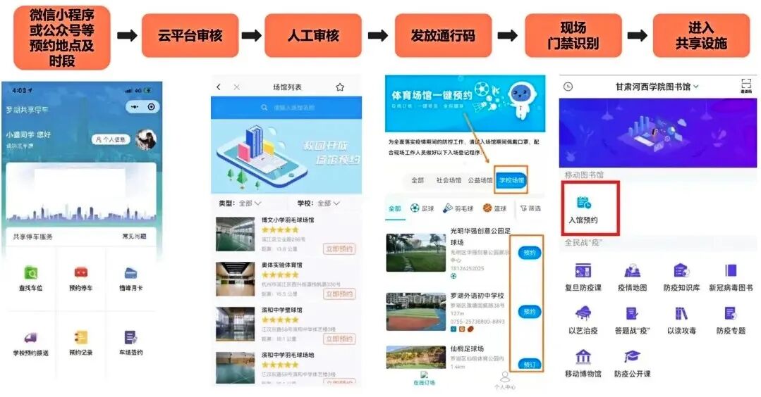 一方面,市民、社区居民等可通过专门的APP、微信程序等智慧管理系统,线上预约学校报告厅、图书馆、体育馆、停车场等。审核预约成功后,才可凭借门禁系统(如二维码扫码)进入校园。