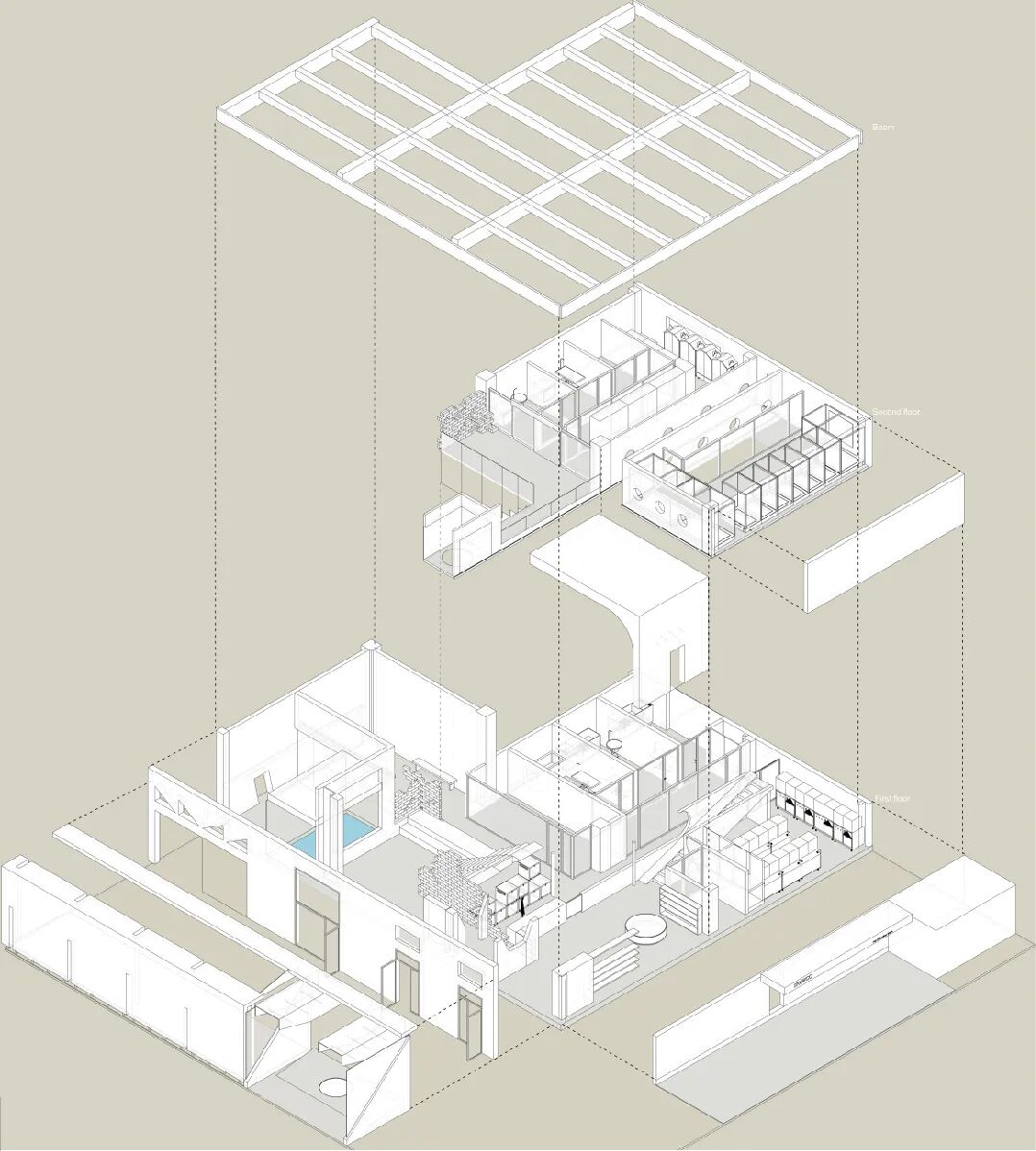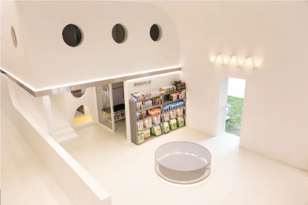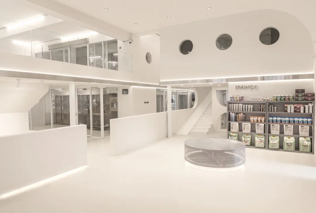 我们将空间分为了三个体块,每个体块都结合一定功能来展示。在两层的容积内,以功能需求和空间逻辑,精细划分出收银、宠物美容,宠物寄养、宠物活动、人宠交流等多个独立区域。从主入口开始便有效隔离猫与狗的空间,互不干扰,避免猫咪应激反应。