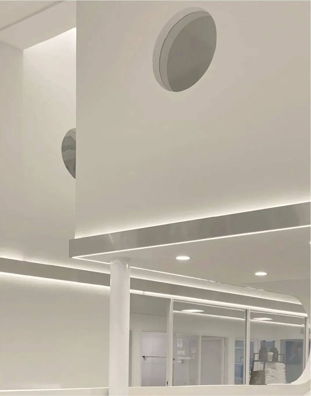 入口虽然设置了两个门,但是利用了半墙的形式,让两者产生互动。收银柜台与半墙连为一体,成为了体块间的划分线。前厅挑空的弧形顶与贯穿整个空间的LOGO石膏砖墙给严肃的空间增添了趣味性。