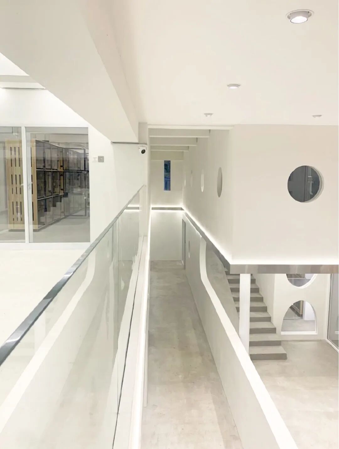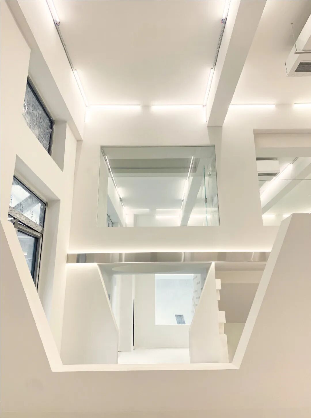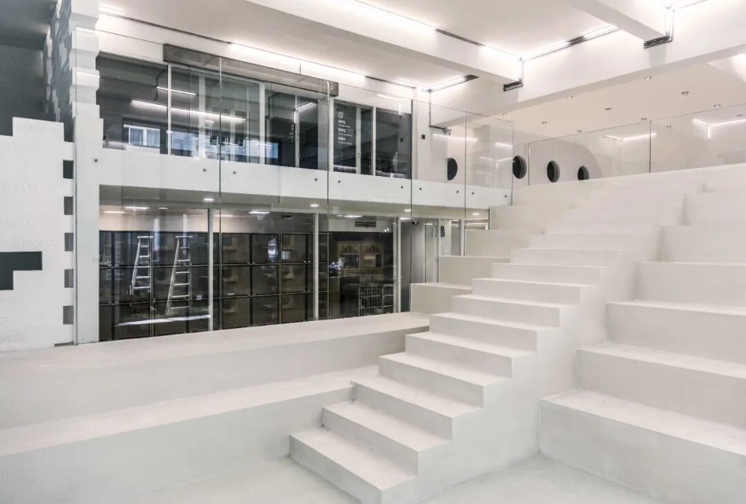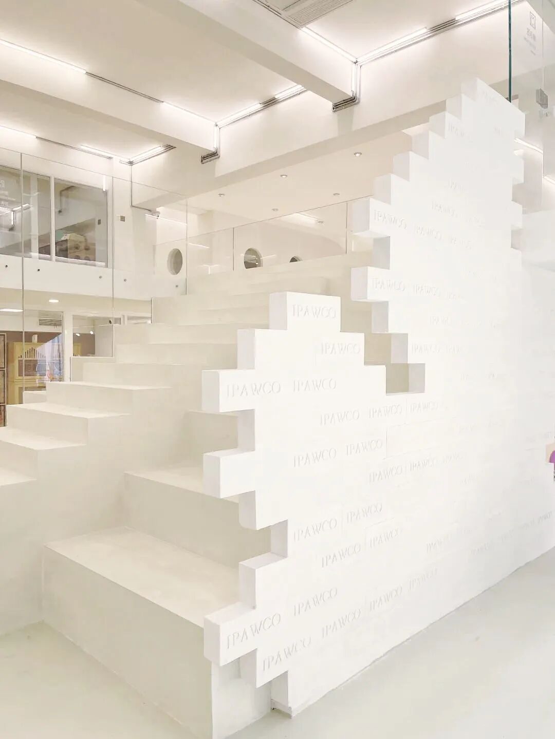 一半斜坡一半阶梯的楼梯是为了让你与你的爱宠保持同一步调上下楼。中间体块的纯白大阶梯是为爱宠人士提供的交流平台,在这里可以依靠阶梯上喝咖啡交流养宠经验。