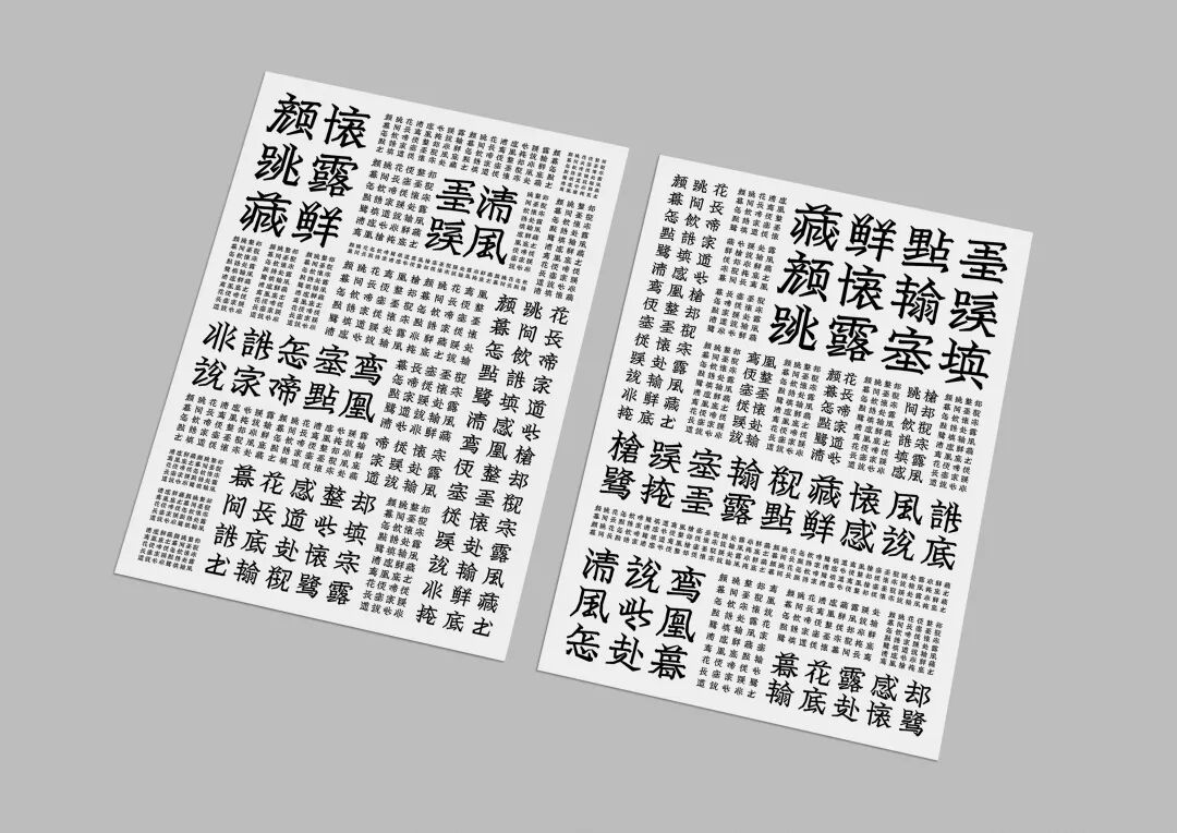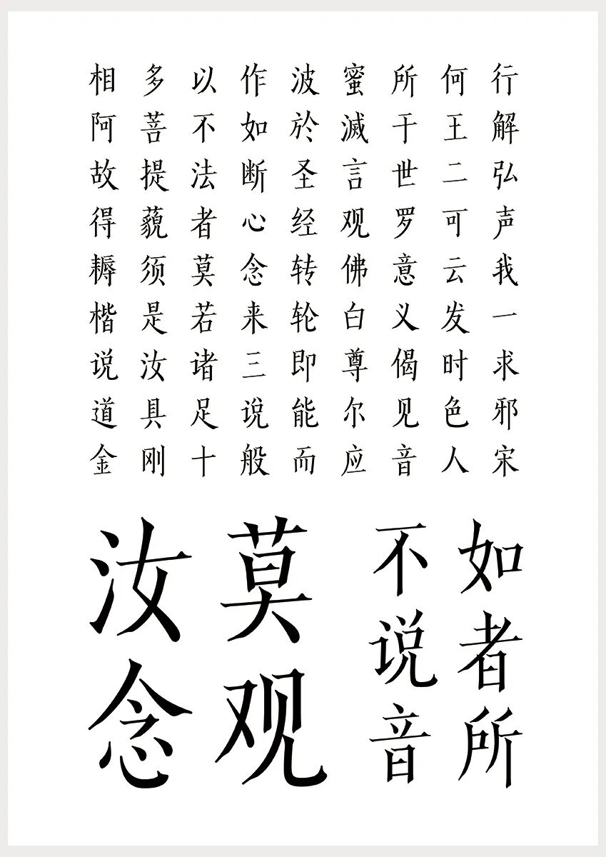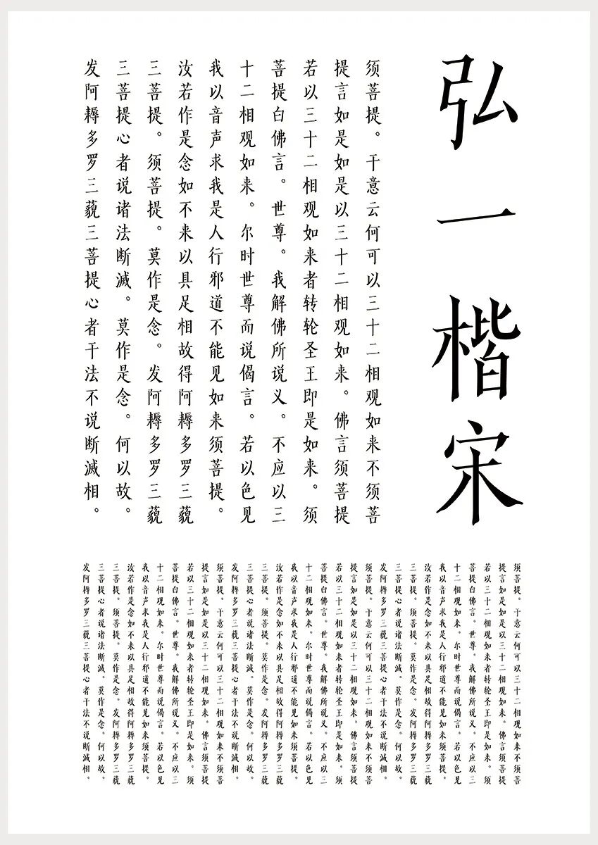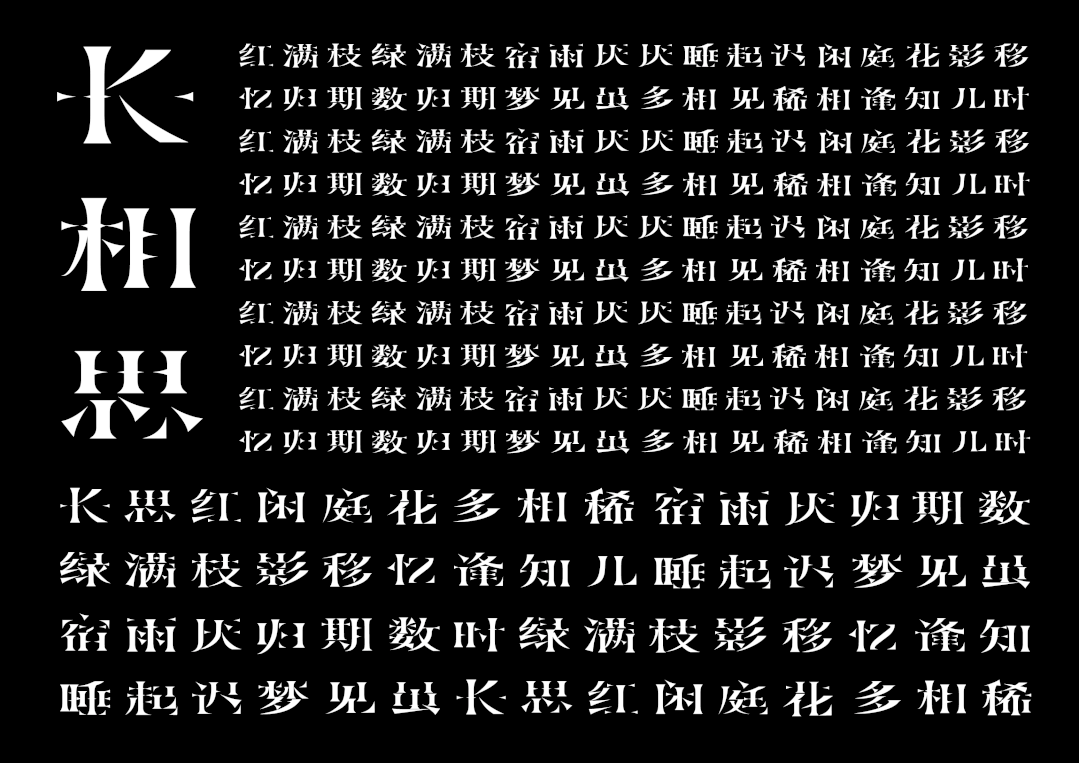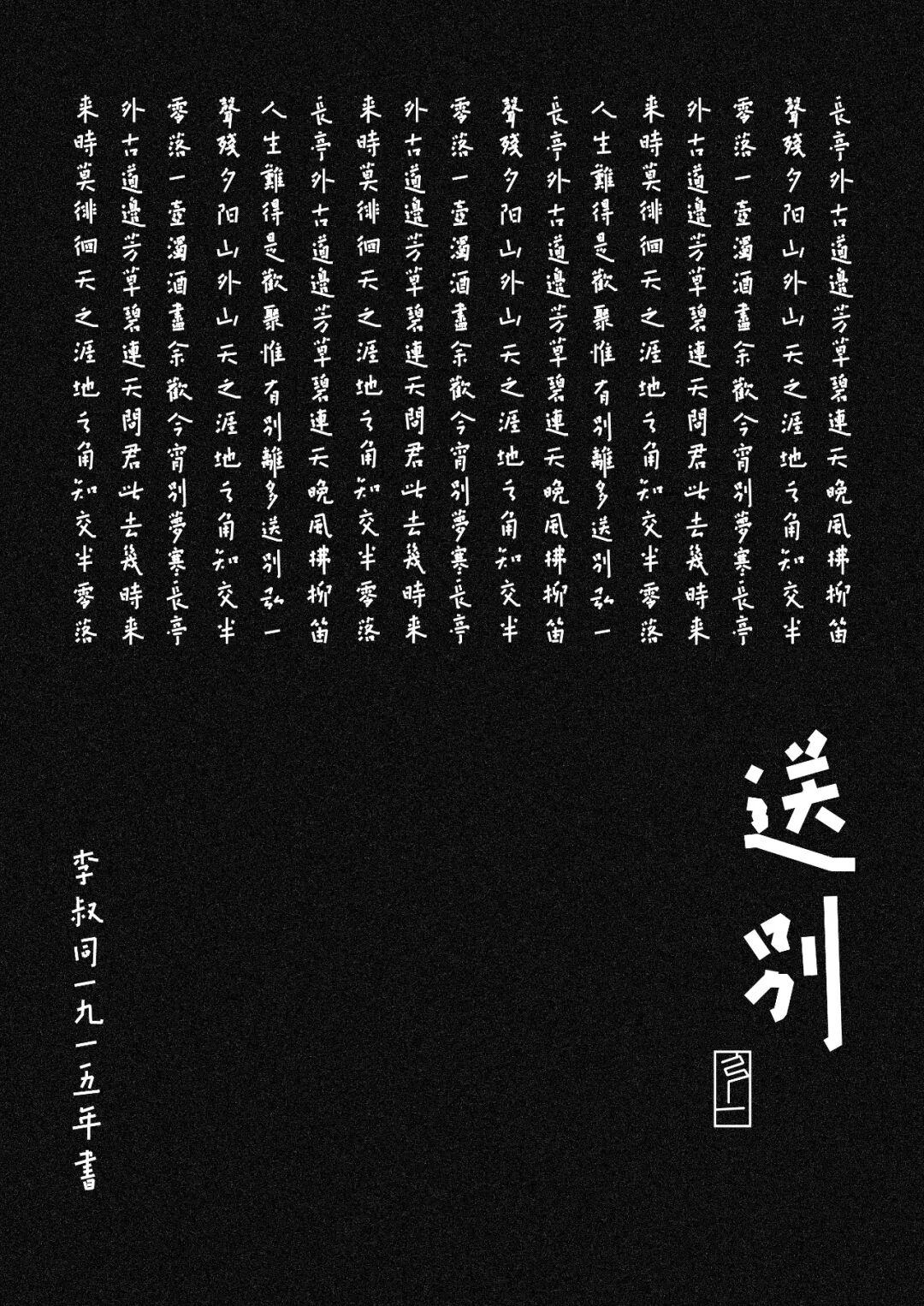 The calligraphy works of Master Hongyi Li Shutong in his later years are called "Hongyi font", which is narrow and long, and his strokes are relatively light and slow, and the space of the writing is very sparse. In the process of designing "Shutong font", the structure and brushstroke characteristics of the font were extracted, with its "loose" posture retained in the structure, and then exaggeration in design was adopted. Besides, modern stroke style of conciseness and hard lines was adopted, which is in marked contrast with the "roundness" and "no edges and corners" presented in "Hongyi font".