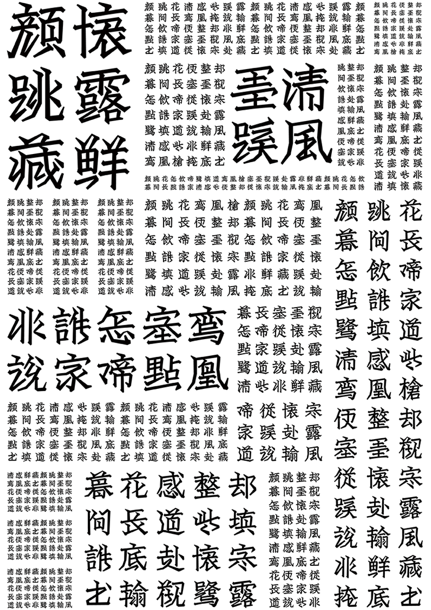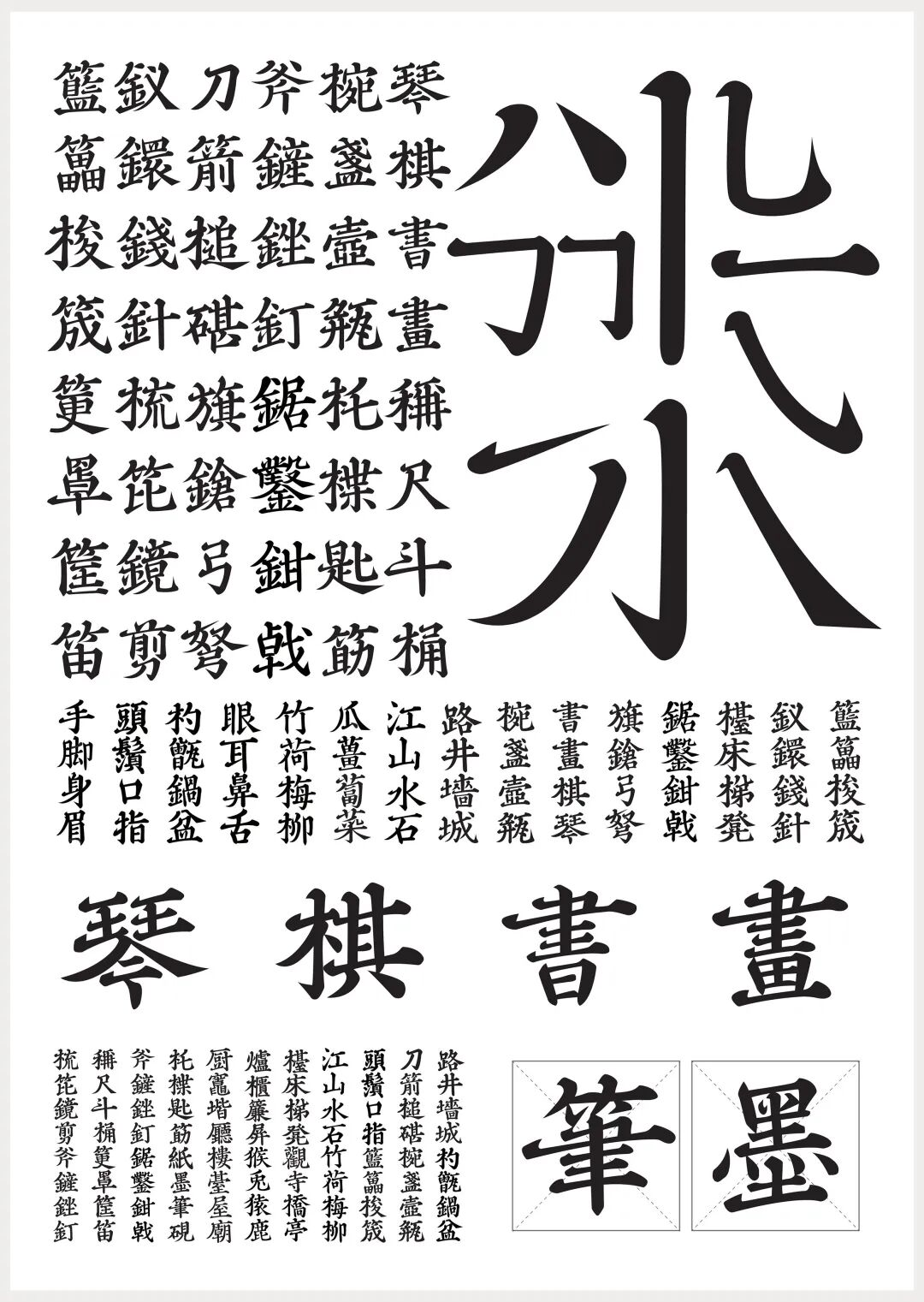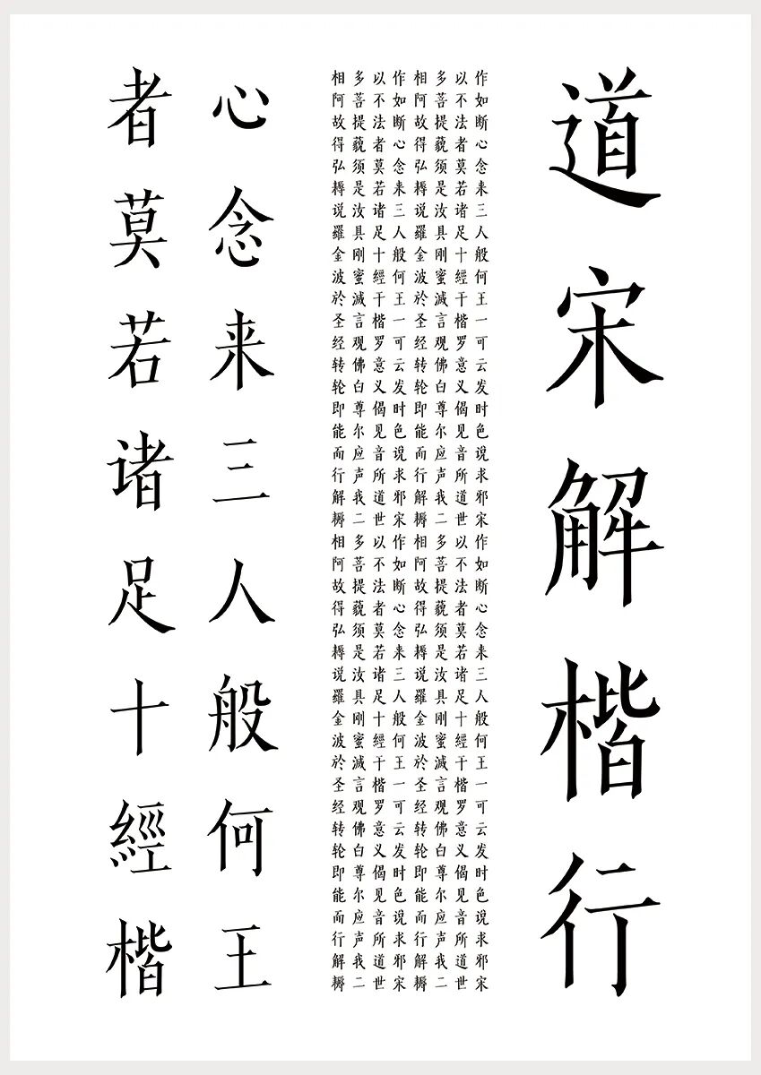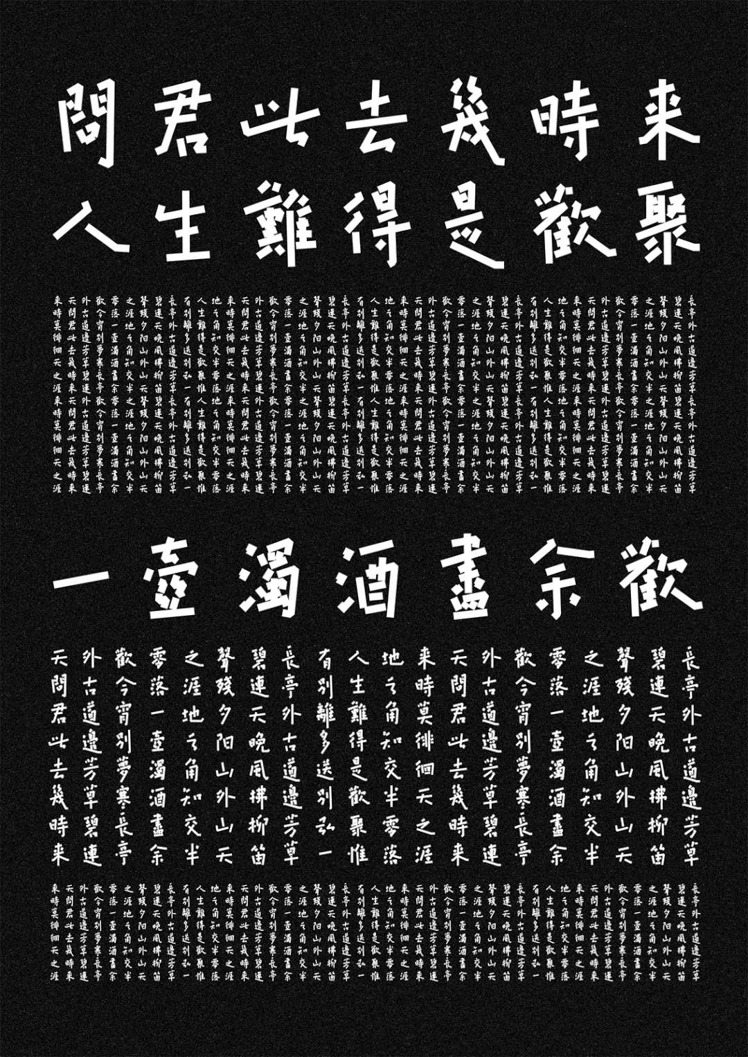 The calligraphy works of Master Hongyi Li Shutong in his later years are called "Hongyi font", which is narrow and long, and his strokes are relatively light and slow, and the space of the writing is very sparse. In the process of designing "Shutong font", the structure and brushstroke characteristics of the font were extracted, with its "loose" posture retained in the structure, and then exaggeration in design was adopted. Besides, modern stroke style of conciseness and hard lines was adopted, which is in marked contrast with the "roundness" and "no edges and corners" presented in "Hongyi font".