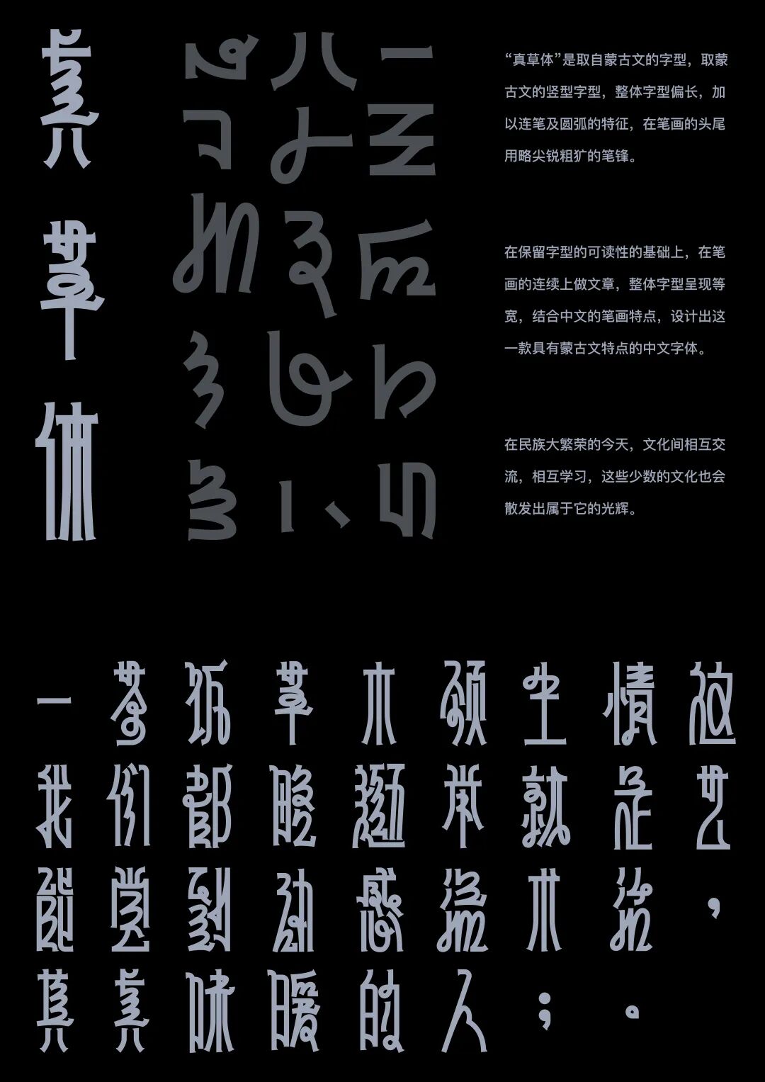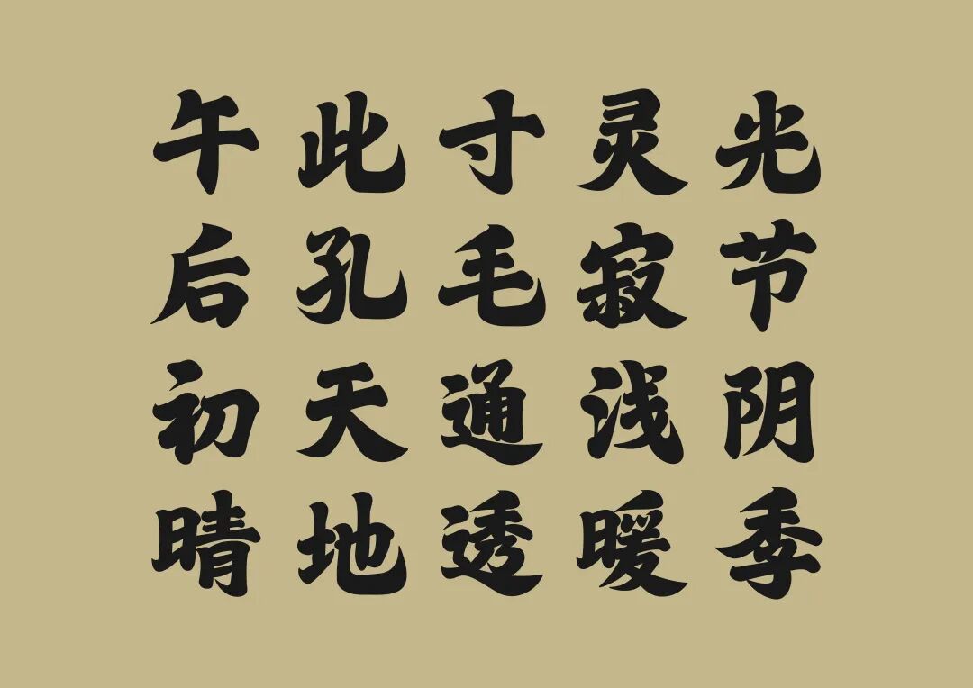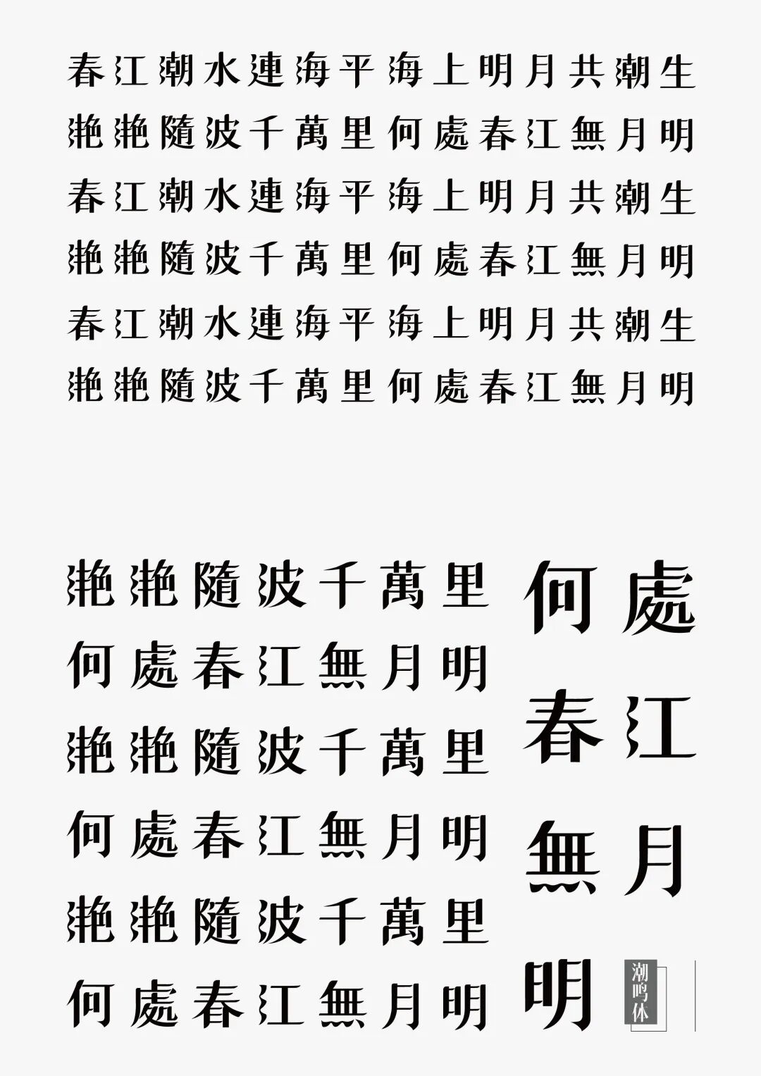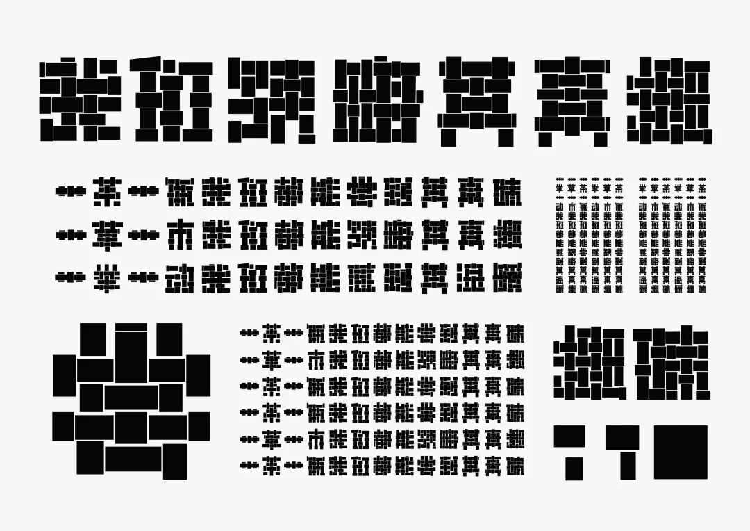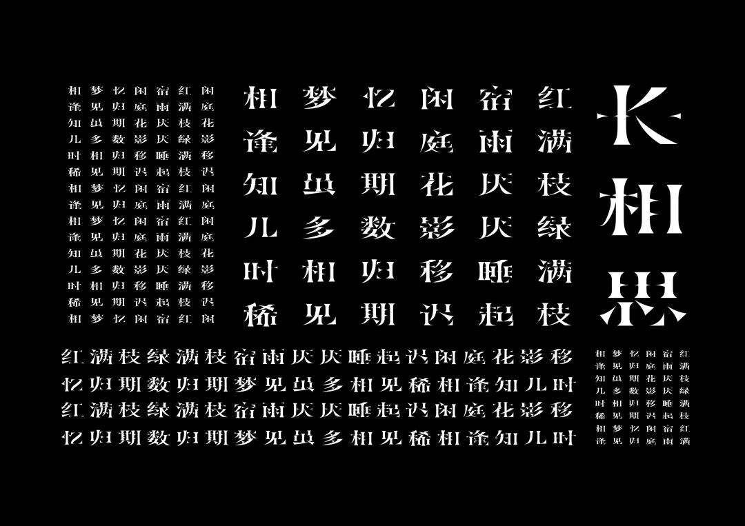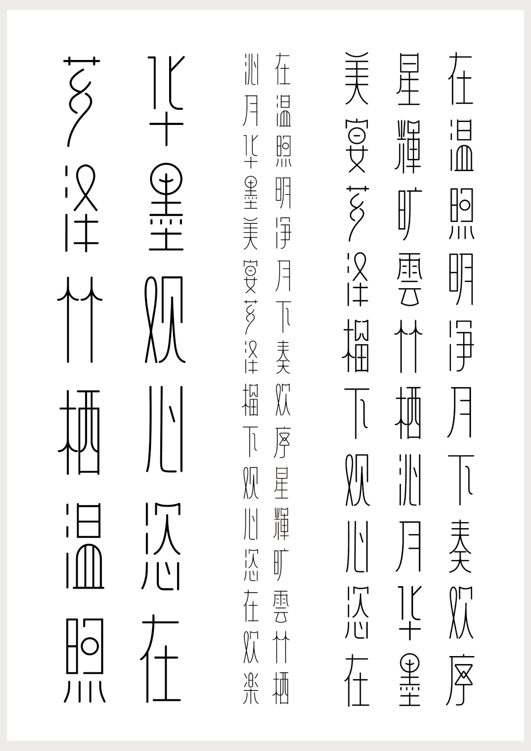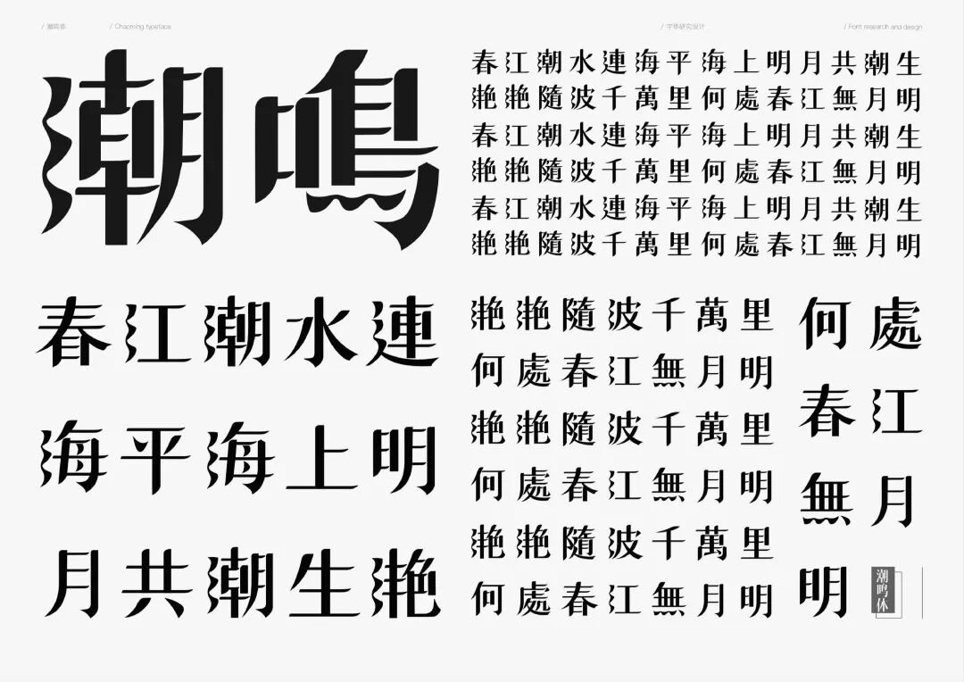 The font is inspired by the "one-stroke drawing" I played in my childhood. The style is combined with the traditional Chinese "charm" drawing method to highlight the softness and beauty of the combined strokes of Chinese characters. At the same time, sharp strokes are also integrated into the starting strokes and turning points. In terms of the overall shape, the design idea of "drawing to rule characters" is determined, which not only retains the necessary identification of characters, but also combines some strokes with cursive script to simplify the complex, so that the overall vision has a sense of flexibility, softness and striking simplicity." In the structure of the text, the "square" characteristics of Chinese characters are deliberately highlighted, and each font is expanded into a square grid by means of denaturalization and appropriate stretching, so as to make the overall vision more unified.