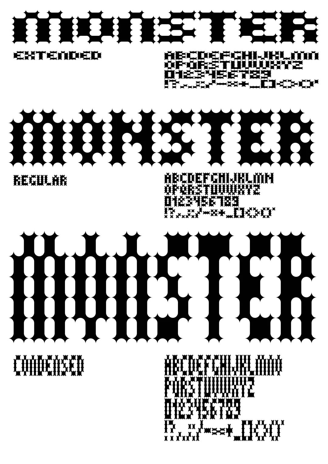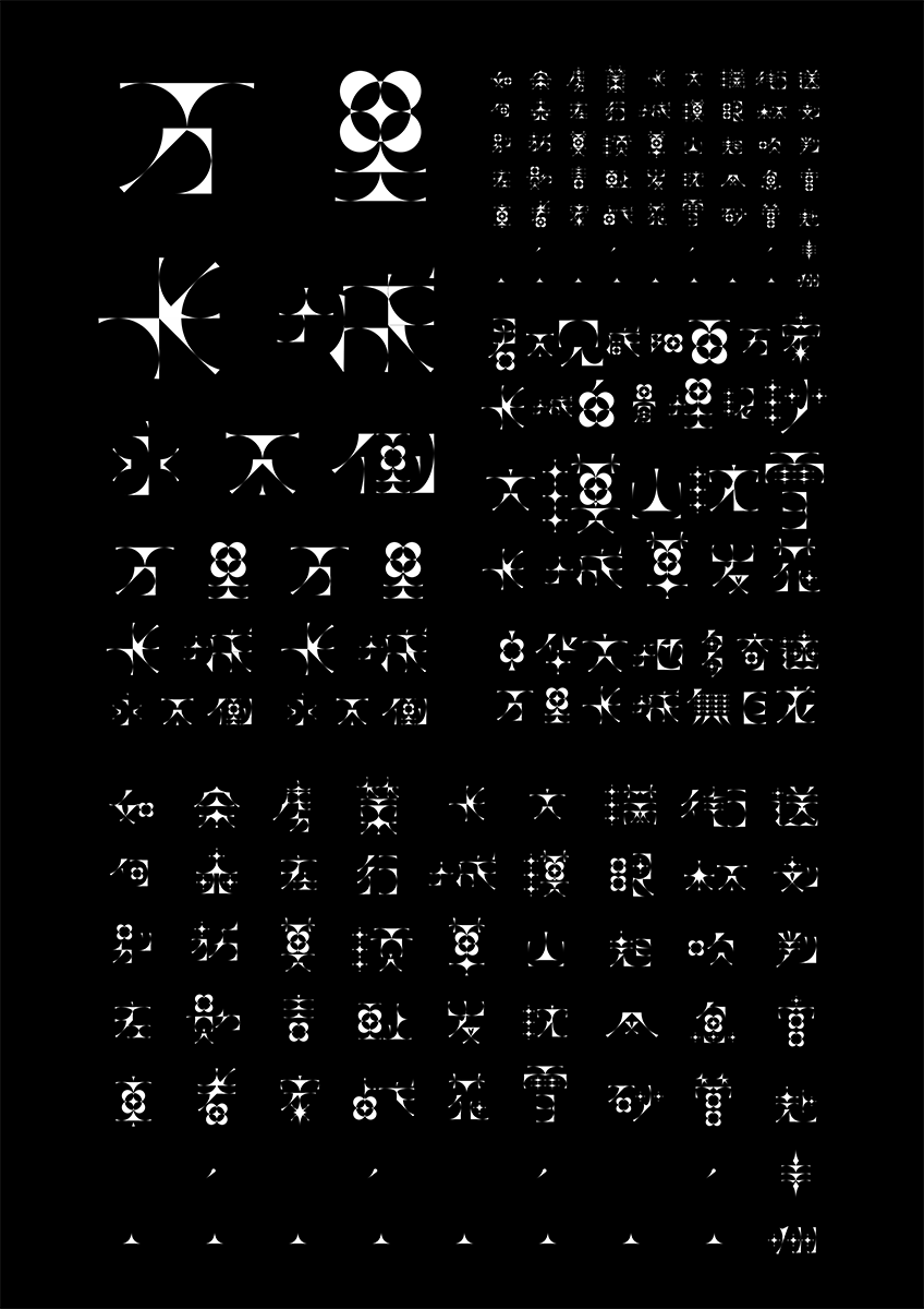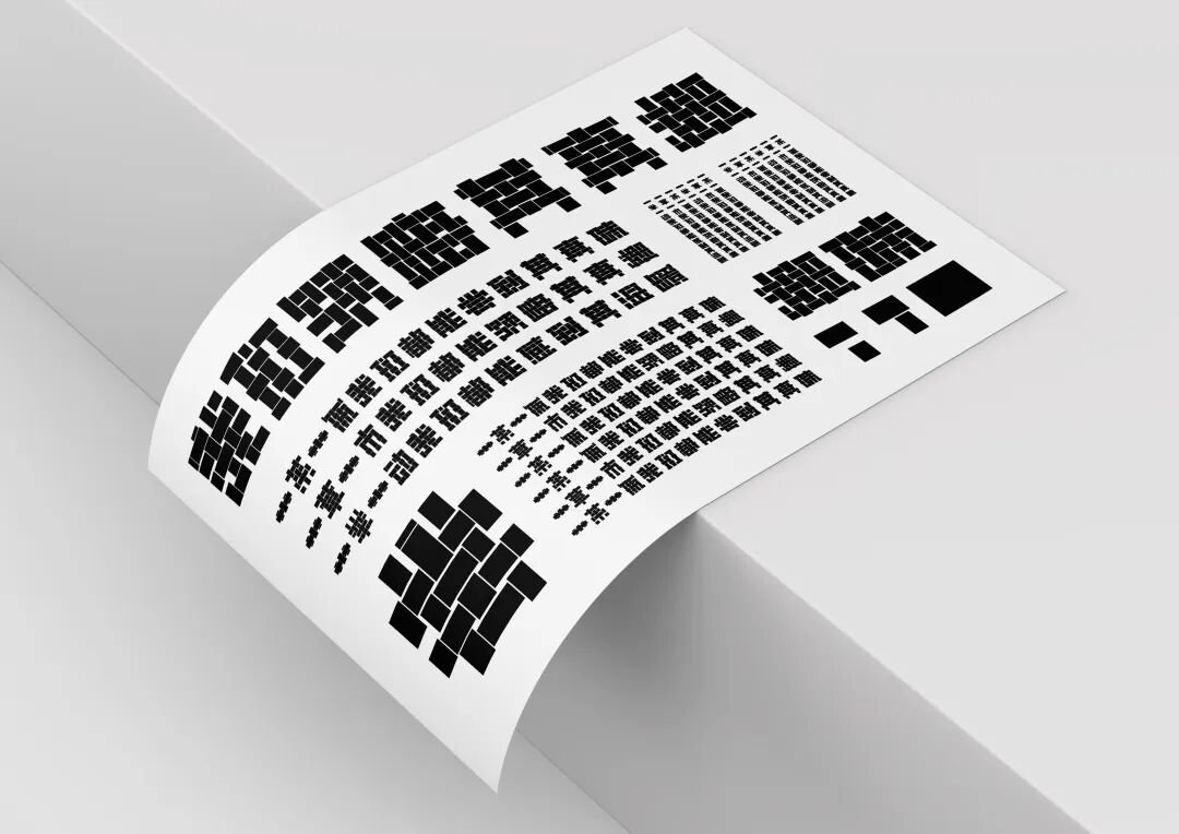 这套字体诞生于一个网格填充游戏,作为造字工具的网格由圆形和正方形组合而成。字体的生成保留了网格,拥有三个字宽和两种风格。