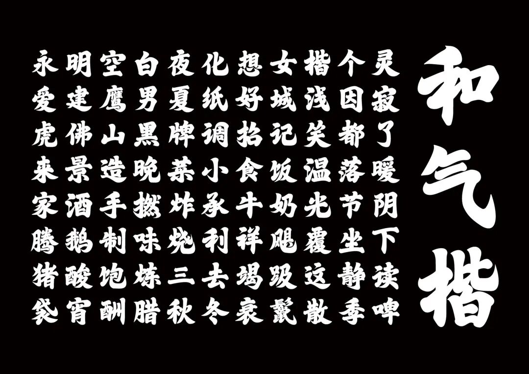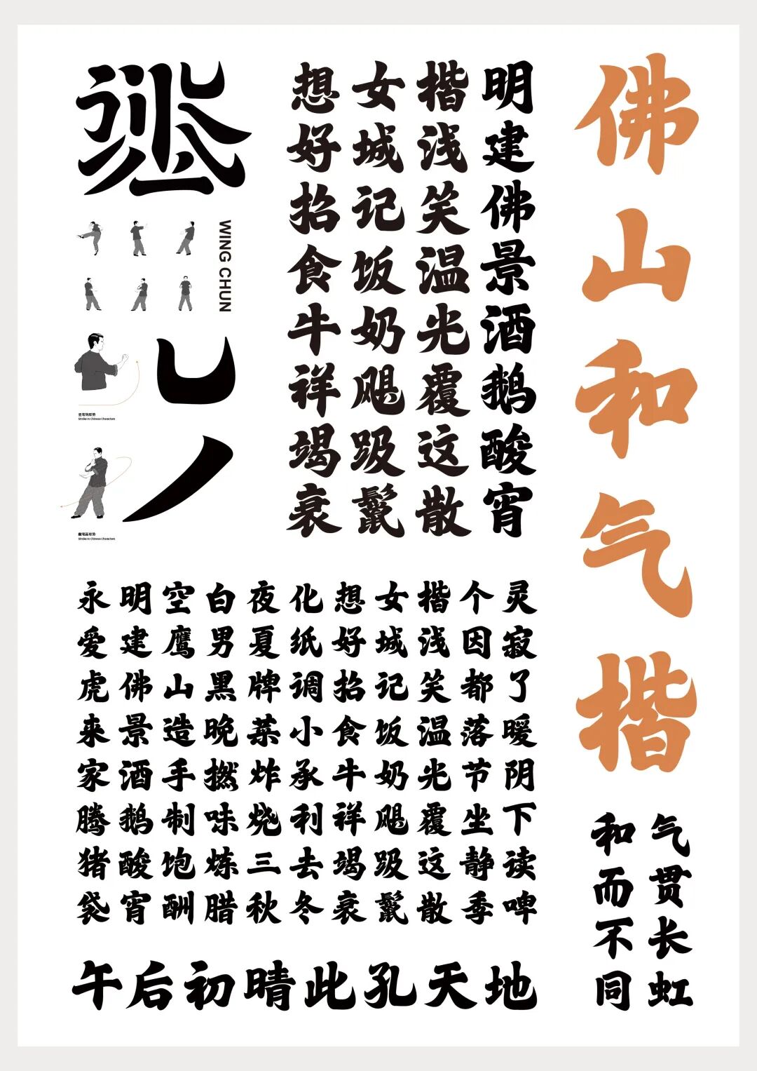 作为一款具现代感的标题型字体,佛山和气楷是以佛山写字师傅李海先生的行楷风格手写字作为结构取势的参考,以佛山咏春的一招一式来具象化成一笔一画的视觉设计。透过武术与书法、现代设计方法与新科技手段的结合,在数位化时代来重现逝去的武林风气。