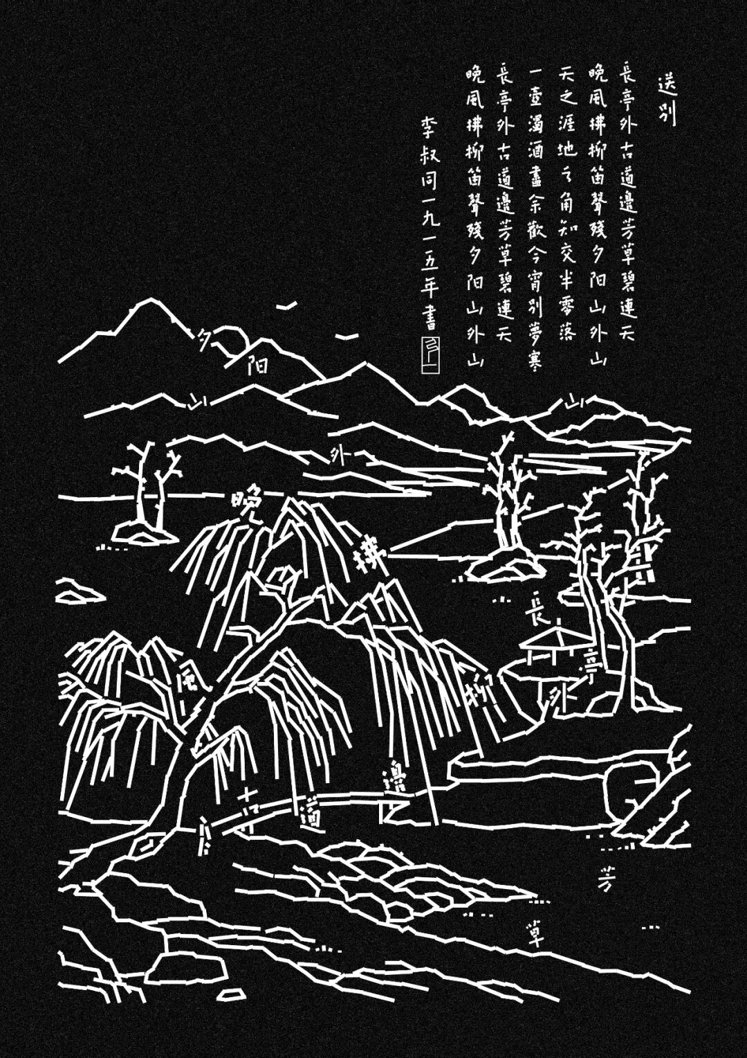 弘一法师李叔同晚年的书法作品被称为“弘一体”,字体偏于狭长,用笔较轻、较慢,章法空间十分疏朗。在设计“折笔叔同体”的过程中,提取其字体的结体和笔法特征,结构上保留“松”的姿态,并加以夸张处理,笔形上采用现代简练的硬线条,与“弘一体”所呈现的“圆融”、“不见棱角”形成鲜明对比。