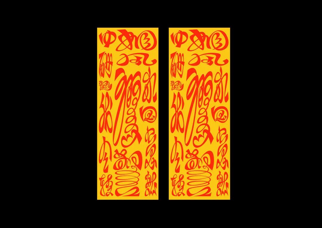 字体的灵感来源于童年时玩过的“一笔画图”,造型上与中国传统“符咒”画法相结合,突出汉字本身的连笔笔势的柔美,同时在起笔与转折等处也融入了尖锐的笔形。整体造型上,确定“以画御字”的设计思路,既保留了文字必要的辨识度,又将一些笔划与连笔草书相结合,删繁就简,让整体视觉同时具备灵动柔美与醒目简洁之感。在文字的结构上特意突出中文汉字的“方正”的特点,通过变性与适当拉伸的手法将每个字体扩充与正方形网格内,使整体视觉更为统一。