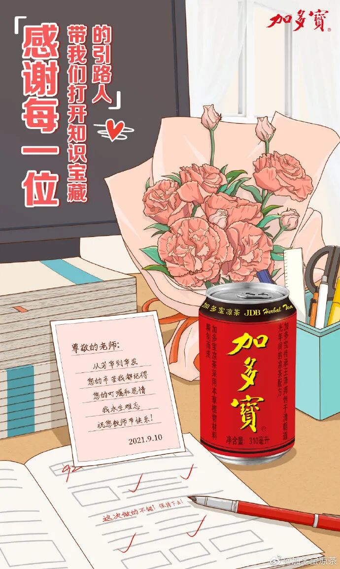 #教师节#老师是学子成长路上的引路人,在日复一日的平凡工作中,用一支粉笔点燃星火希望。教诲如春风,师恩似海深。无论是教书,还是立德,老师一直用真心滋养学生们的成长!值此教师节来临之际,加多宝与你一同铭记师恩,由衷地说一句,老师,您辛苦了!