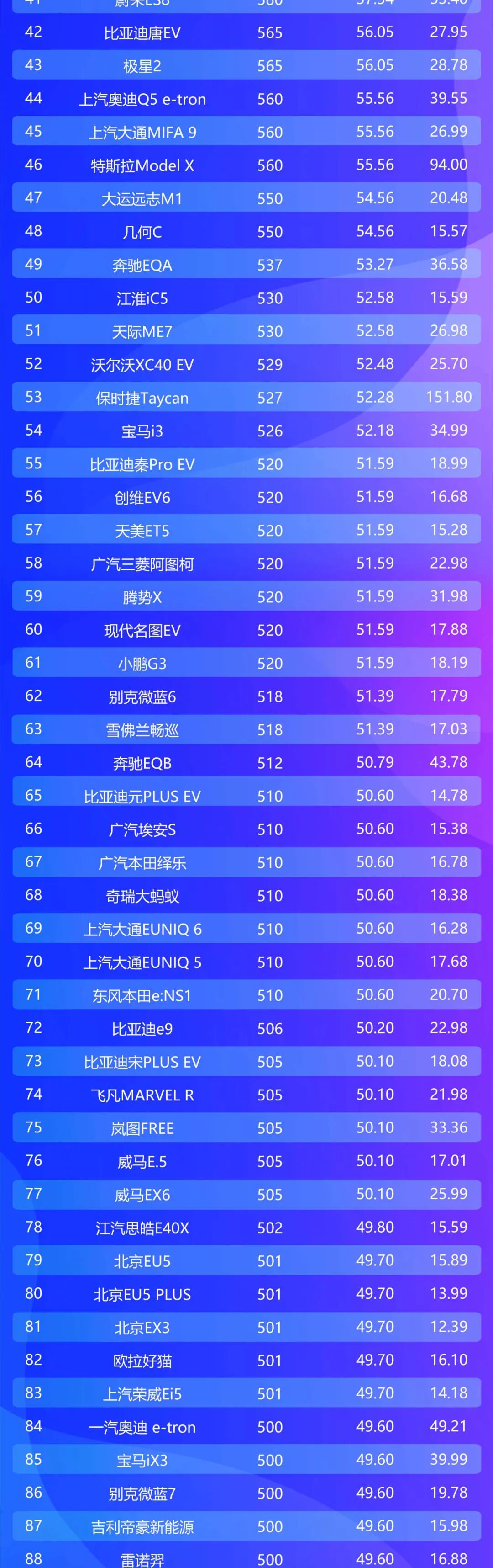 值得一提的是,比亚迪汉EV正式进入了前三,续航715公里,仅次于广汽AION LX PLUS以及奔驰的EQS。这也是比亚迪的车型首次进入前5名。