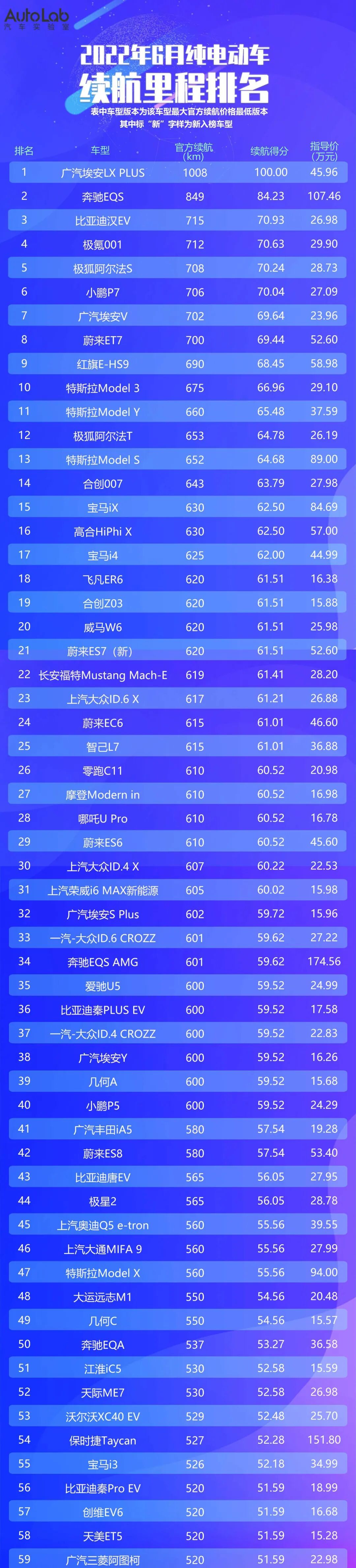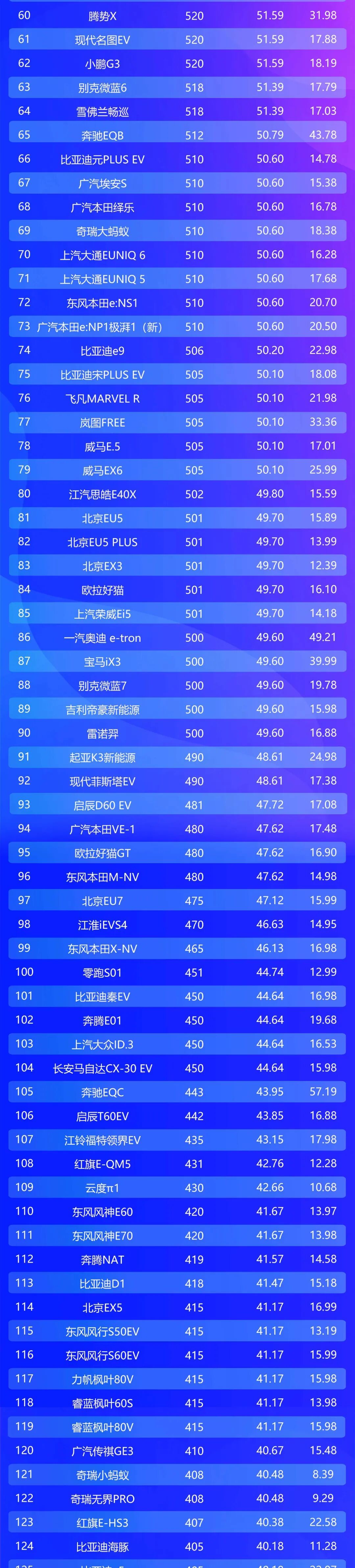 不过此次几款车型,除了蔚来ES7的续航达到了600公里以上,其余三款车均不算长,因此榜单的前20名都并未发生变化。依旧是广汽埃安LX PLUS位居第一,奔驰EQS紧随其后。