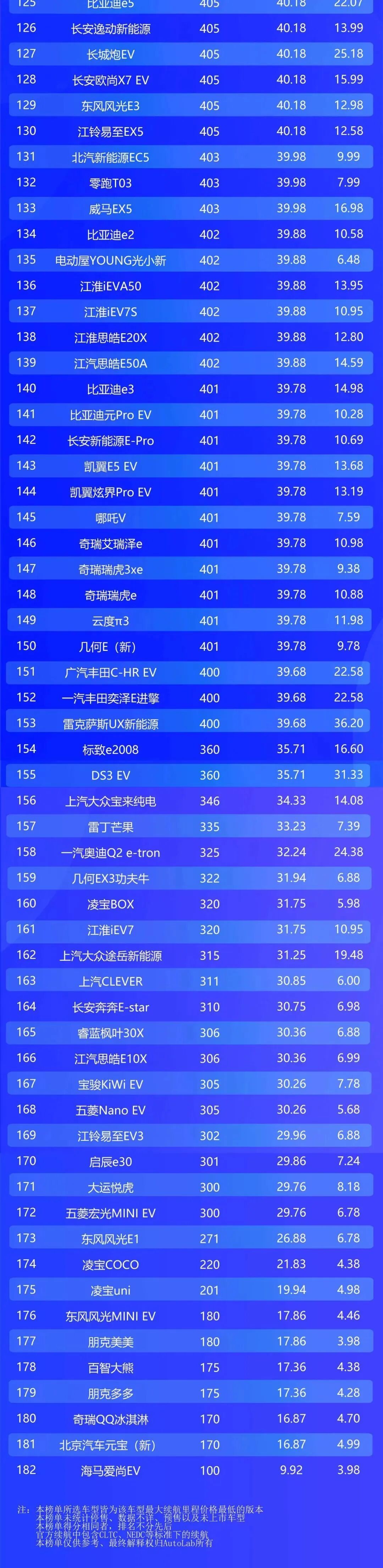 至于蔚来为何没有统计150kWh版本的车型,这里要申明一下,蔚来150kWh车型的车型均未正式上市,而处于预售阶段的新车,榜单暂不将其收录。