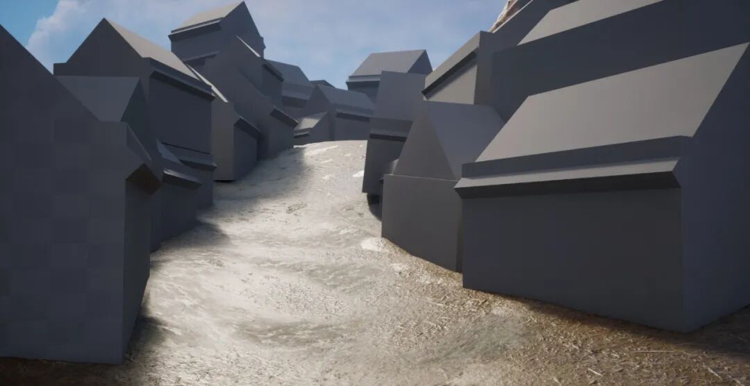 打开Unreal后,我做的第一件事是非常快速地绘制风景草图,然后用简单的灰色立方体快速概括小镇的形态,以设置出我想要重现的街道情景。