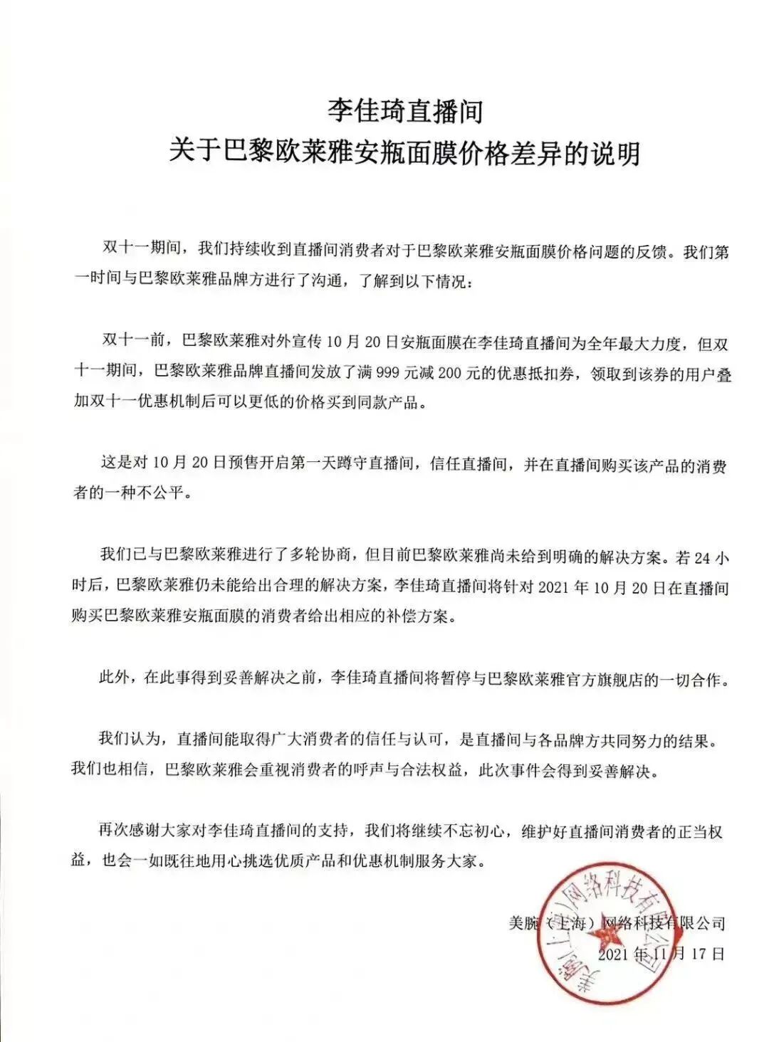 随后,巴黎欧莱雅安瓶面膜差价事件“当事人”李佳琦、薇娅于11月17日晚在微博表态。李佳琦公司美腕(上海)网络科技有限公司发布声明称,已与巴黎欧莱雅进行了多轮协商,但巴黎欧莱雅尚未给到明确的解决方案。若24小时后,巴黎欧莱雅仍未能给出合理的解决方案,李佳琦直播间将针对10月20日在直播间购买巴黎欧莱雅安瓶面膜的消费者给出相应的补偿方案。