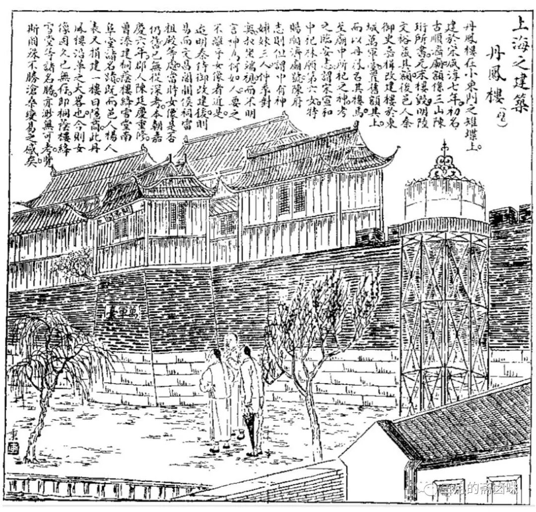 明万历初年,有人建议将丹凤楼重建于万军台上,并将陈珩之匾额献出。由于丹凤楼是“殿、台、楼、阁”中最高的一座,登楼远眺黄浦江、端午登高观赏大赛龙舟的最佳地点,于是“凤楼远眺”就被列为“沪城八景”之一。据清人葛元煦在《沪游杂记》中说:丹凤楼“在城东北隅,楼阁皆附于城堞,窗临黄浦,可以观涛”。因此登斯楼,“川原之缭绕,烟云之吐吞,日月之出没,举在眉睫”。“凤楼远眺”老图片显示的就是这样的风光,它是老图片中唯一一张绘画而成的,而不是照片。