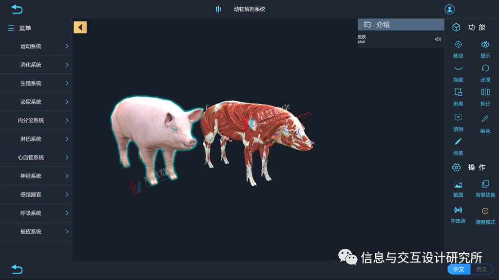 利用vr技术开发引进的VR动物解剖教学平台,学生可以查看包括狗、猫、牛、猪、鸡、鱼、青蛙、老鼠、马等十几种动物,公母各一套,每套有皮肤系统、肌肉系统、骨骼系统、呼吸系统、循环系统、神经系统、消化系统、生殖系统、淋巴系统 9 大系统,还有猫、狗影像教学系统等数据资料。