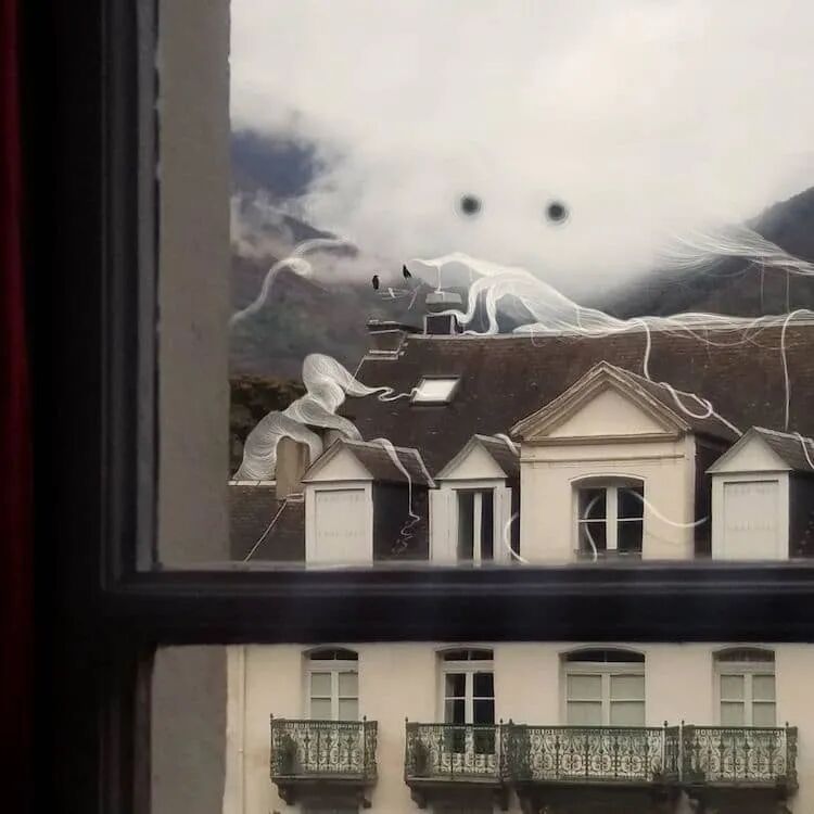 沃贾·桑切斯首先拍摄了很多乡村景观的照片,然后再用白色的墨水,极细的线条,勾画出纤细的外形。每一只不明生物都似乎是从云层延伸出来,它们模糊的四肢以及伸出的手指,抓住了山丘和森林。另外,它们巨大的黑眼珠,充满可爱和好奇的表情。