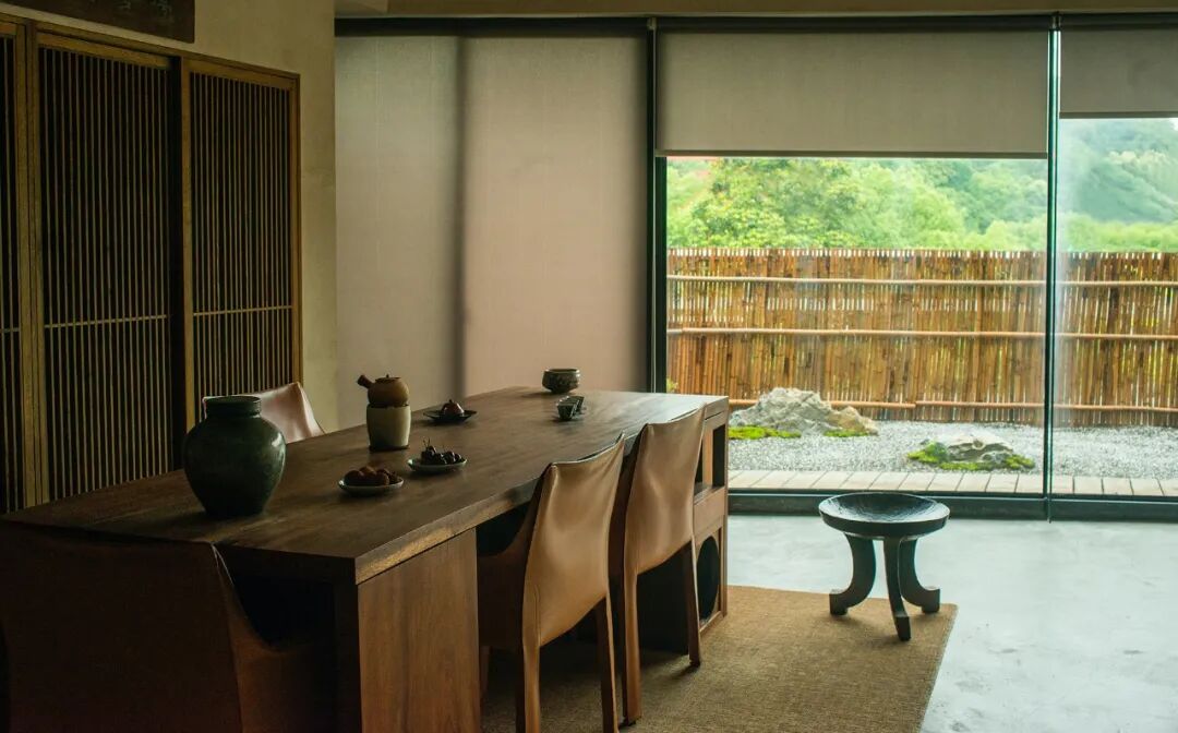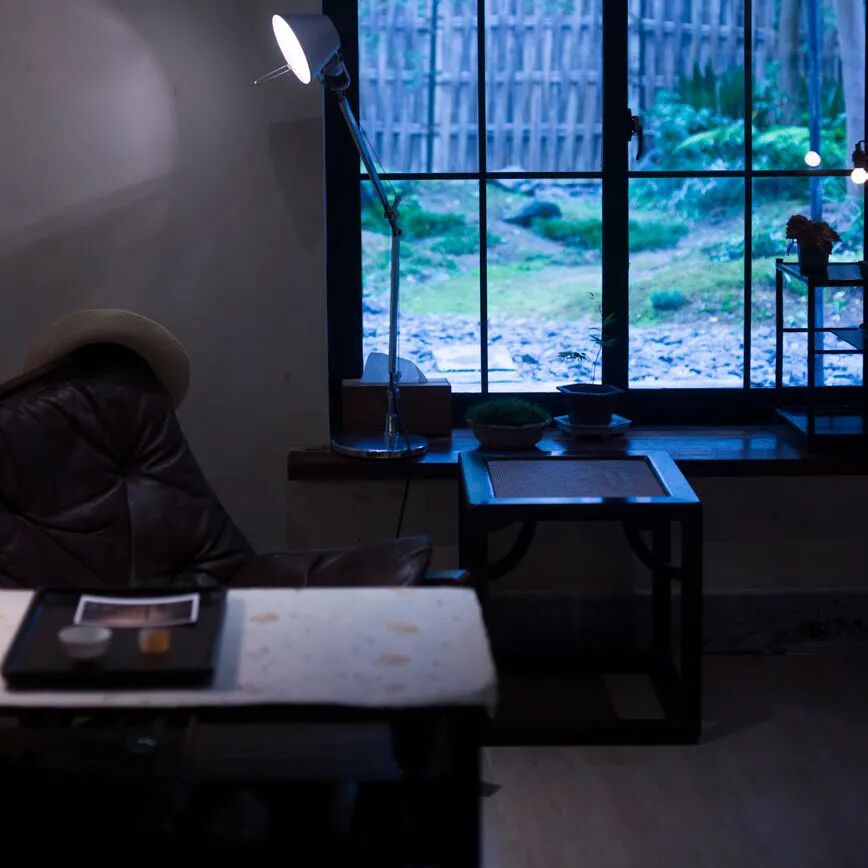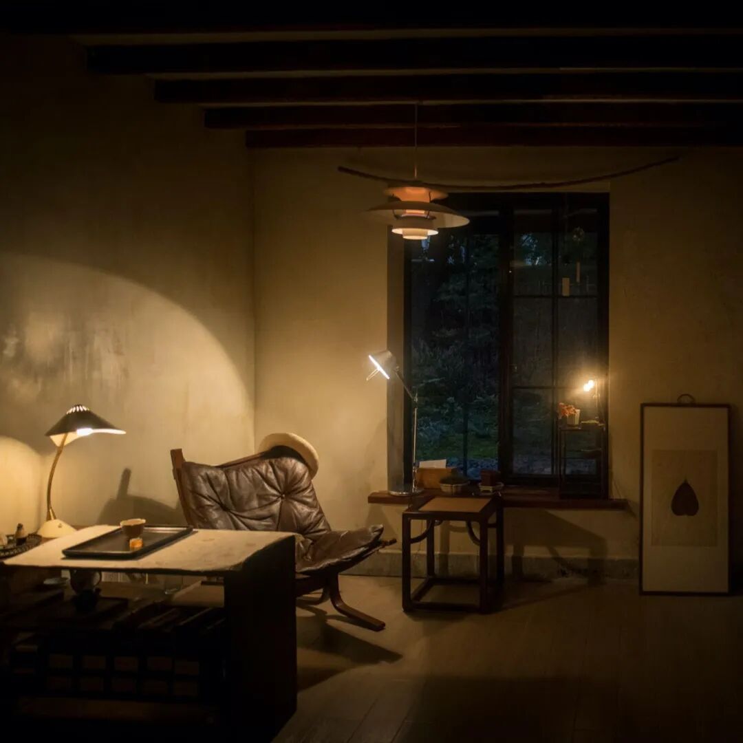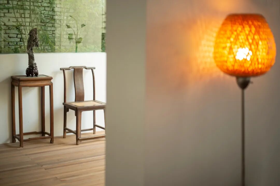 放一把古椅,一台烛灯,当灯光照射时,白墙上便展现出曲折蜿蜒的投影,自然景色在室内得到延续,也是无界的理念体现。白色的墙面、茶桌之间保持着一定距离,像是某种精神上的对话,产生了距离美。
