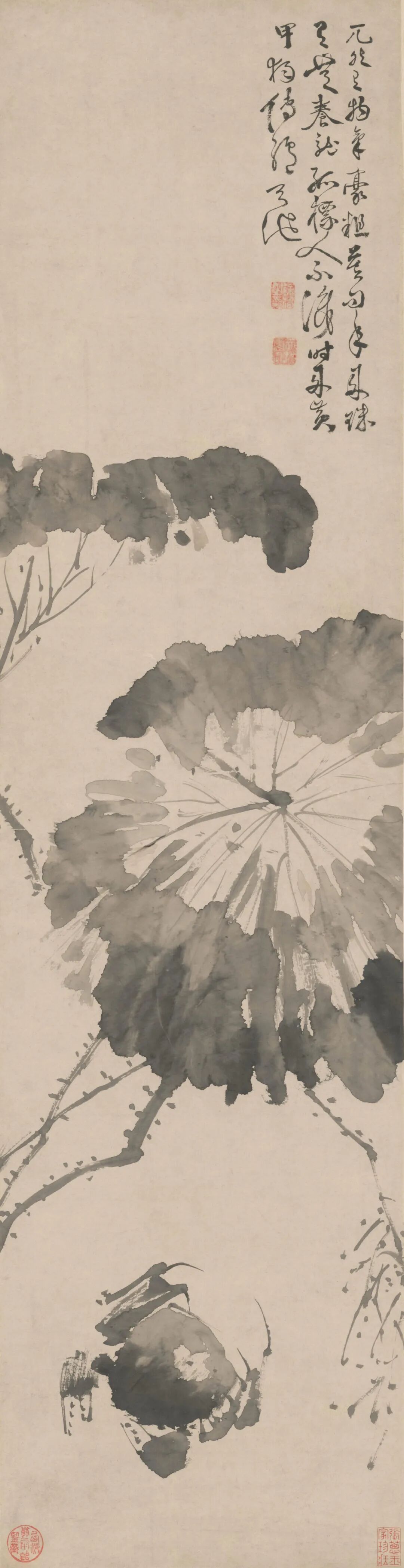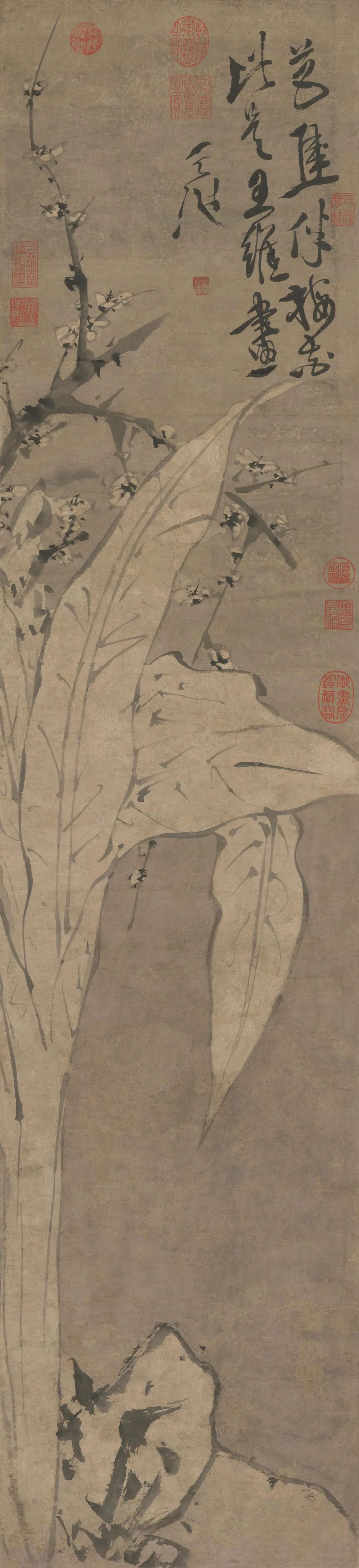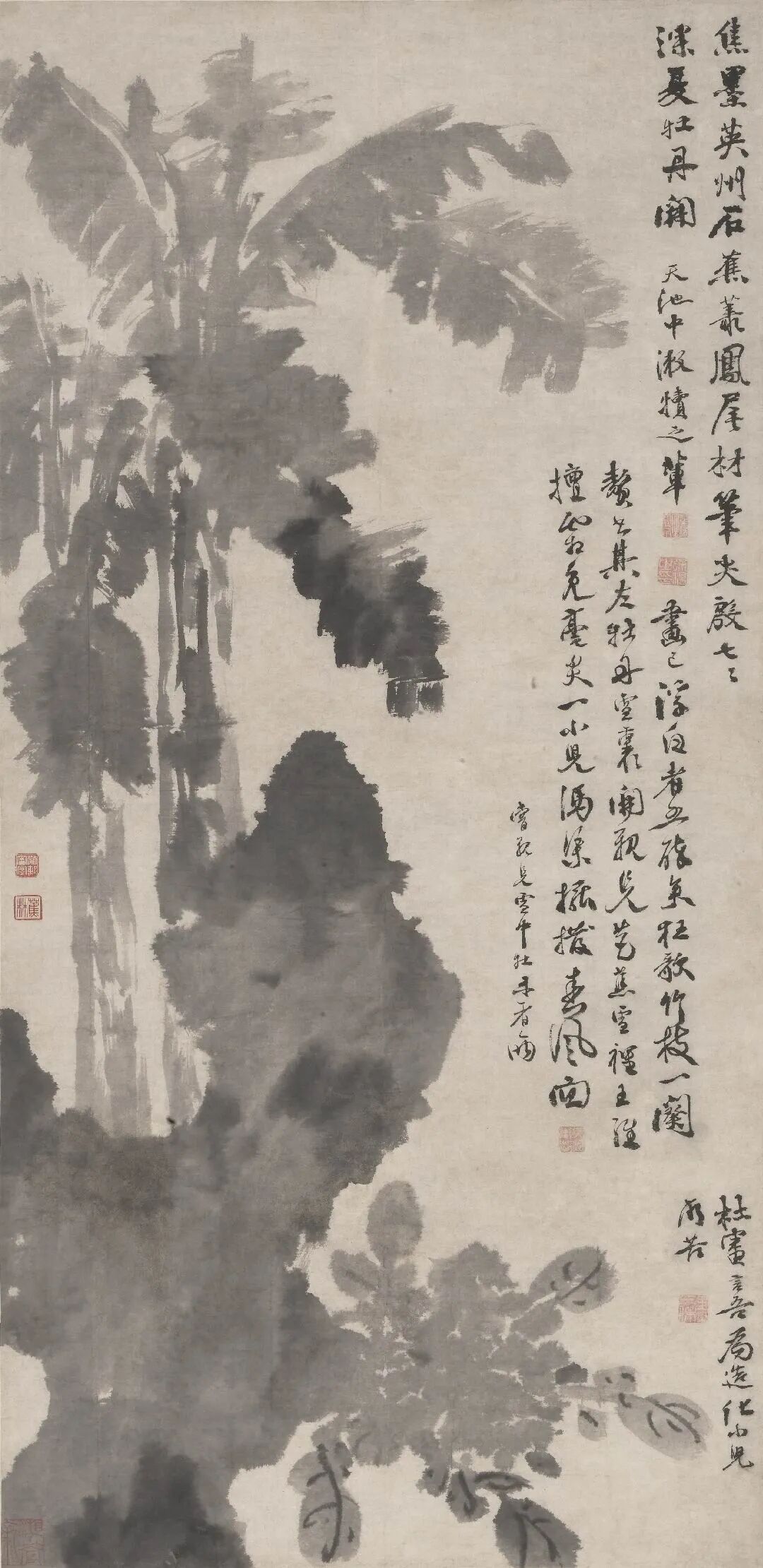 藏于上海博物馆的《蕉石牡丹图轴》,水墨渲染,分出层次,没有勾勒,墨不加胶,有氤氲流荡的趣味。图中所画为芭蕉、英石和牡丹花。这是一幅极端情绪化的作品,上有题识数则,记录一次癫狂作画的经过。初题说:“焦墨英州石,蕉丛凤尾材。笔尖殷七七,深夏牡丹开。天池中漱犊之辈。”又识:“画已,浮白者五,醉矣,狂歌竹枝一阕,赘书其左。牡丹雪里开亲见,芭蕉雪里王维擅。霜兔毫尖一小儿,凭渠摆拨春风面。”旁有小字:“尝亲见雪中牡丹者两。”在右下又题云:“杜审言:吾为造化小儿所苦。”