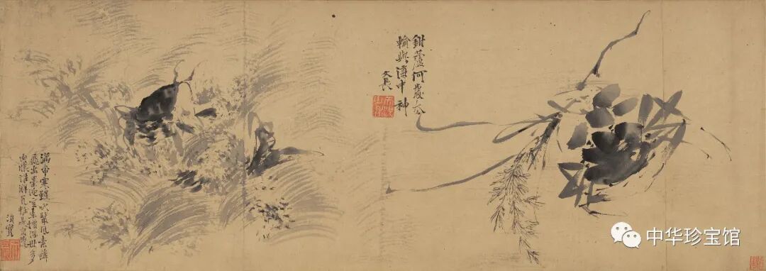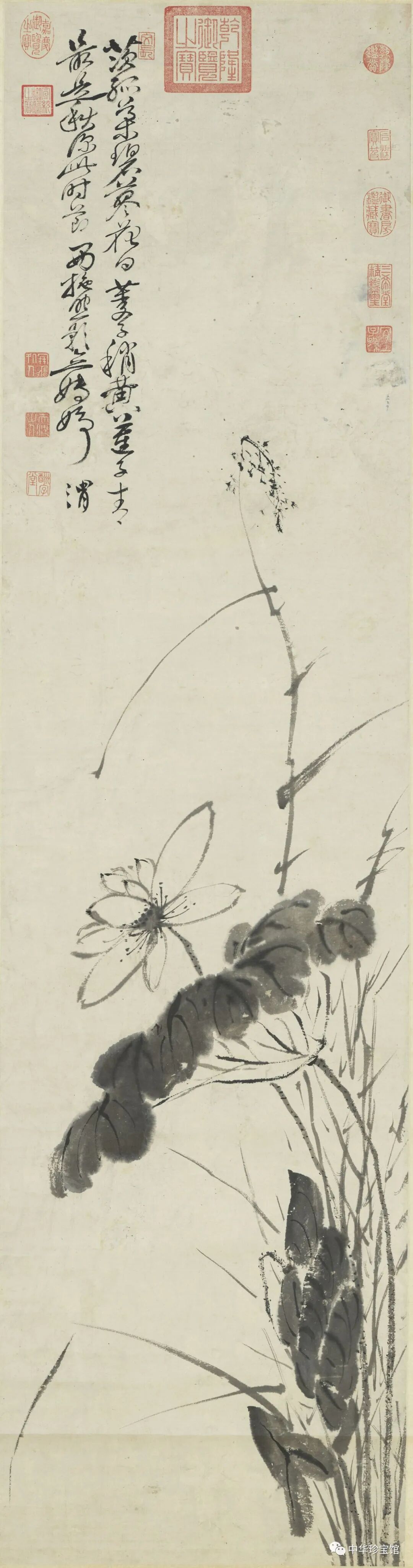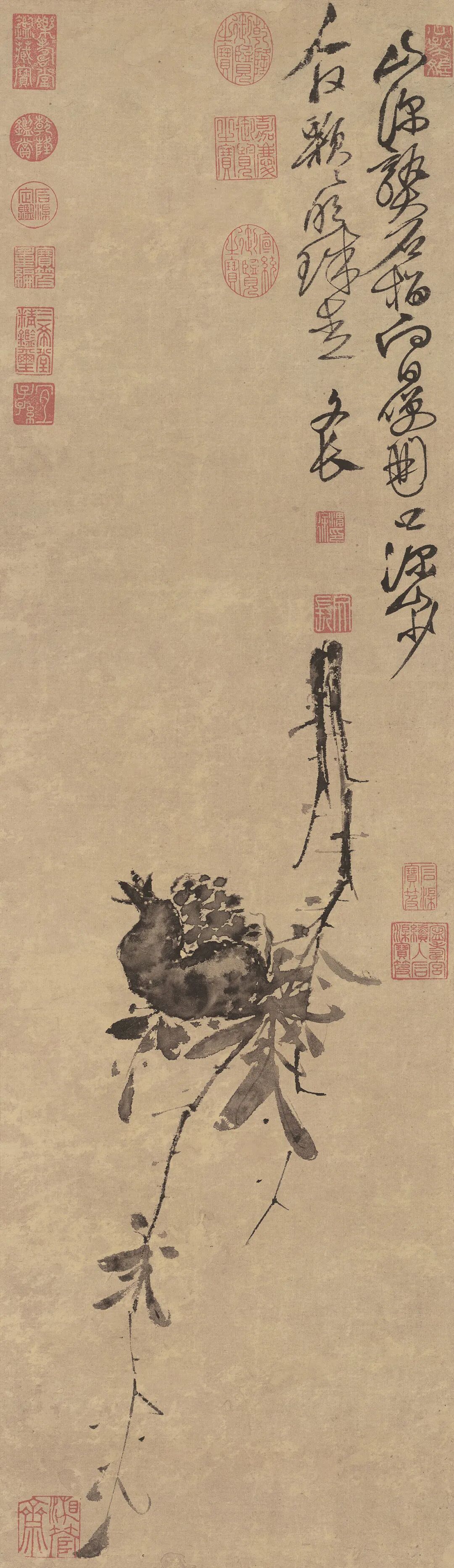 藏于上海博物馆的《蕉石牡丹图轴》,水墨渲染,分出层次,没有勾勒,墨不加胶,有氤氲流荡的趣味。图中所画为芭蕉、英石和牡丹花。这是一幅极端情绪化的作品,上有题识数则,记录一次癫狂作画的经过。初题说:“焦墨英州石,蕉丛凤尾材。笔尖殷七七,深夏牡丹开。天池中漱犊之辈。”又识:“画已,浮白者五,醉矣,狂歌竹枝一阕,赘书其左。牡丹雪里开亲见,芭蕉雪里王维擅。霜兔毫尖一小儿,凭渠摆拨春风面。”旁有小字:“尝亲见雪中牡丹者两。”在右下又题云:“杜审言:吾为造化小儿所苦。”