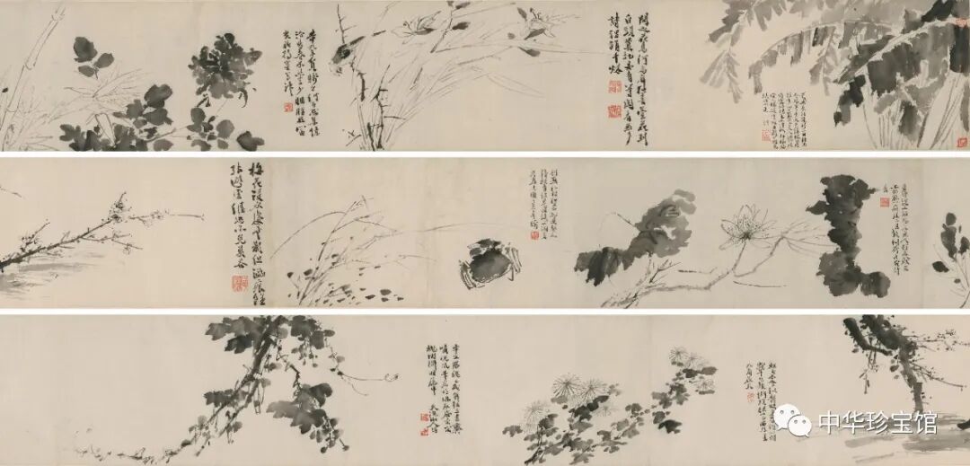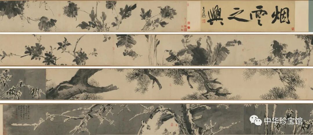 北京故宫藏有徐渭《四时花卉图轴》,此画杂竹,芭蕉、梅花、藤花、牡丹、秋葵、竹、水仙、兰为一体,不是乱插花枝,而是活灵活现地傍地而生,朵朵开放,跃跃生机,时间的顺序被抽去,常识被打破。上有题诗道:“老夫游戏墨淋漓,花草都将杂四时。莫怪画图差两笔,近来天道够差池。”诗画相映,表现这样的意思,一切都在时间的流动中变化着;一切随变化而出现的花草形态都是一种表相。他的“墨戏”,尽显其“差池”之相。
