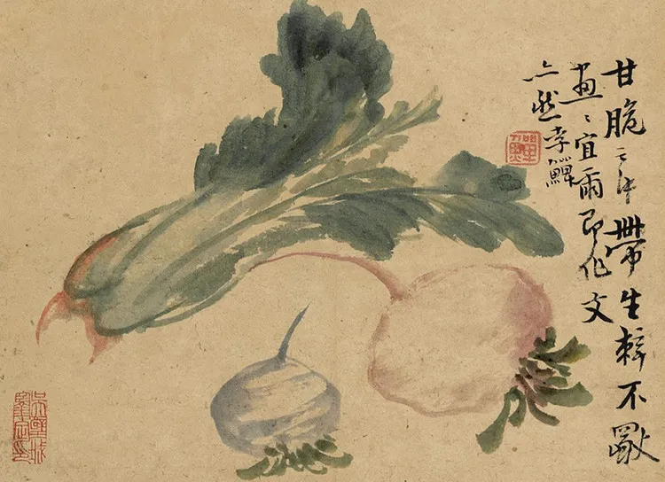 李鱓的笔底纵横,他不仅画兰、画竹、画牡丹、画凤凰这一类文人常画的花鸟,他还画葱、姜、瓜、茄、山芋、荸荠、芋头、茭白、松鼠、蛤蟆、蚕桑一类习见的常物,充满生活气息。
