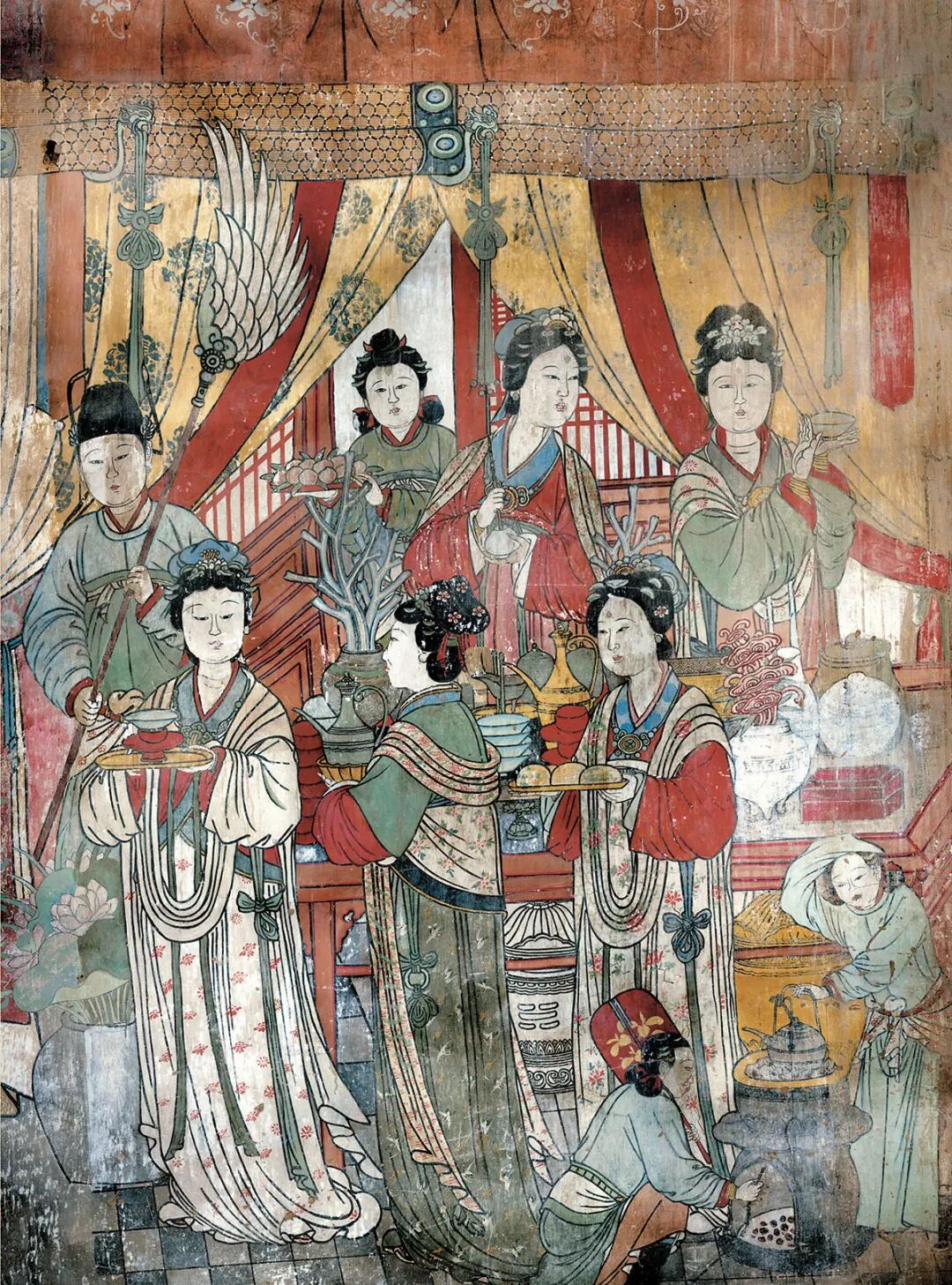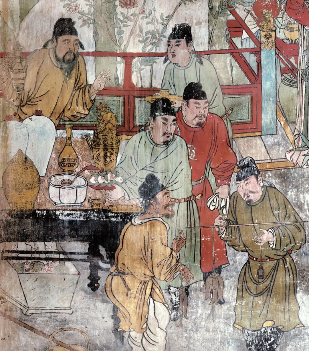 干货2023-08-24 徐岩红:洪洞水神庙元代壁画的制作技术 [摘 要] 洪洞水神庙壁画是中国壁画艺术的重要组成部分,具有鲜明地域特色和传统艺术特征,在中国古代壁画艺术史上具有一定的代表性。该作品图像清晰、色调明亮,以生动的人物形象、高超的艺术手法和故事结构描述了元代山西地区典型的社会生活、精神信仰和价值观念,涵盖了元代科技、文化、艺术、生活等诸多历史元素。本文拟利用现已发现的洪洞水神庙壁画考古资料,结合有关历史文献和学术界已有的研究成果,从科学技术的层面对洪洞水神庙壁画进行分析研究与探讨,以期能够丰富洪洞水神庙壁画艺术的研究内容,为研究元代的科学技术发展状况提供可信的参考资料。 洪洞水神庙亦称“明应王殿”,位于山西省洪洞县城东北17公里处的霍泉源头,是祭祀霍泉神——明应王李冰的庙宇。在其主殿明应王殿内四壁绘有200多平方米的精美壁画。据题记载,此壁画是元泰定元年(公元1324年),由洪洞、赵城一带的“绘画待诏”:东安村赵国祥、周村商君锡、南祥村景彦政等人绘制完成。洪洞水神庙壁画艺术笔法苍劲、设色浑厚典雅、内容丰富,有著名的戏剧壁画“大行散乐忠都秀在此作场”;有表现水府诸神的祈雨图和降雨图;有充满宫廷氛围的司宝图、尚食图和充满生活气息的庭院梳妆图、渔翁售鱼图等。除此之外,还有园林、村舍、街市以及各种人物、民俗,包括了社会、经济、文化、戏曲、体育、娱乐、建筑等各个方面,是一组完整的囊括诸多方面内容的充满了浓郁生活气息和地方色彩的元代壁画珍品,充分体现了元代山西地区绘画艺术成就,为我们研究中国古代壁画艺术以及社会、宗教等方面提供了翔实的史料。同时,洪洞水神庙壁画艺术是在传统艺术的基础上,经过长期探索和演变,继承和发展起来的,元代的科学技术的进步,为壁画艺术提供了更为广泛的材质、工具和表现内容。因此,论文以洪洞水神庙壁画的壁制材料及其工艺和壁画的绘制技法为研究对象,以展示其技术内涵,从一个侧面反映元代山西地区科学技术的发展状况,为我们认识元代的科学技术发展水平提供重要的图像资料。 一、洪洞水神庙元代壁画中的绘制技法 洪洞水神庙壁画中的各种造型写实、逼真、绘制精确,画工们把现实生活中的自然景物、古式建筑、宫廷人物、民俗民风以及人物服饰衣着、表情动作等方面的内容运用一定的绘制技术全部揉于画面之中,表现得栩栩如生,淋漓尽致,极富艺术魅力,所以水神庙壁画不仅是一座蕴藏丰富的艺术宝库,同时也是一座反映中国古代绘图技术成就的殿堂。 (一)透视法在水神庙壁画中的应用 透视(perspective)是指透过透明平面来观看事物,从而研究它们的形状。透视理论亦称“中心投影理论”,是研究在平面上如何把我们看到的物象投影成形的原理和法则的学科,即研究在平面上立体造型的规律。在中国古代绘画理论中称之为“远近法”。元代的画工们将这种按照正确的比例方法表达物体的尺寸和形状的绘画理论和方法应用于水神庙壁画的人物、器物、建筑、山水等内容的表达之中,使壁画描绘的内容达到了细致入微的程度。而且元代的画工们不仅只是定性地了解描绘物体要遵循近大远小的视觉规律,还清楚地知道通过定量的计算确定地描画处于不同位置的物体。以《祈雨图》为例,画面最下方的地方官吏手持奏折跪在台阶下,台阶的描绘按照近大远小的透视理论和等比规律向内递减,显示出一种空间延伸的感觉。 (二)水神庙壁画蕴涵的光学原理 壁画的色彩称为装饰色彩,它是以色彩学的光学原理为基础,但不同于绘画的色彩光学理论,而是强调色彩的心理学意义,即色彩对人心理的影响。它以形式美的需要为出发点,以主观意识为主导选择,基本上不考虑固有色,可以理想化、浪漫化地处理颜色而不必顾忌自然规律,具体的说,就是要符合装饰色彩的一般原理。洪洞水神庙壁画以暖色为基调,朱砂、朱膘、石黄、土朱为主,当这类暖色作用于人的视觉时,能够刺激人的心理反应,激发出人的主观感受。同时壁画兼用石青、石绿平涂。冷暖对比使人的眼睛处于兴奋状态,这是因为不同明度、彩度、色相吸收和反射光的波长不同, 对人的视网膜的刺激也不同,色调对比越强,刺激的起伏越大,造成的心理感应越强,因此壁画的色彩以红色和绿色为主。但是色彩对比强烈,画面容易不谐调,为克服此弊端,元代的画工们通过降低色彩纯度,用朱砂、朱膘、石青、石绿等低纯度的色彩处理画面,同时用土黄等中介色间隔对比色,使色彩协调起来,画面显得既丰富又和谐,从而形成了水神庙壁画色彩明艳,富丽浑厚的特点。 二、洪洞水神庙元代画壁中的材料工艺 洪洞水神庙元代壁画受它所依托的材料工艺的影响,而材料工艺和当时的生产力发展密切相关。宋元时期科学技术的进步,为壁画艺术提供了更为广泛的材质和表现内容,促使这一时期的壁画艺术登上历史上的第一座高峰。 (一)洪洞水神庙画壁的壁质材料 洪洞水神庙在殿堂墙壁的下部用青砖砌筑高1米左右的坎墙(亦称“下肩”),再加上殿身下部设有高出地面的台基,这样可以充分防止潮气上侵,对于保持墙体通风干燥、防止壁画受潮变质均有重要的作用。而用于绘制壁画的墙体,是用土坯或未烧制的砖坯砌筑,土坯或未烧制的砖坯可以吸收