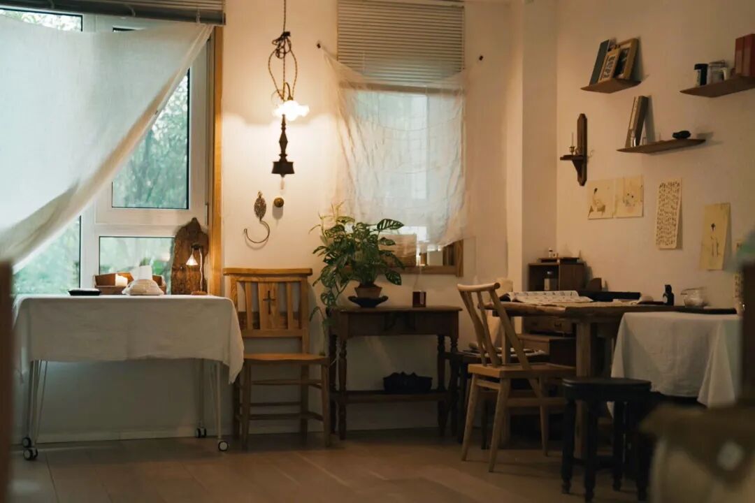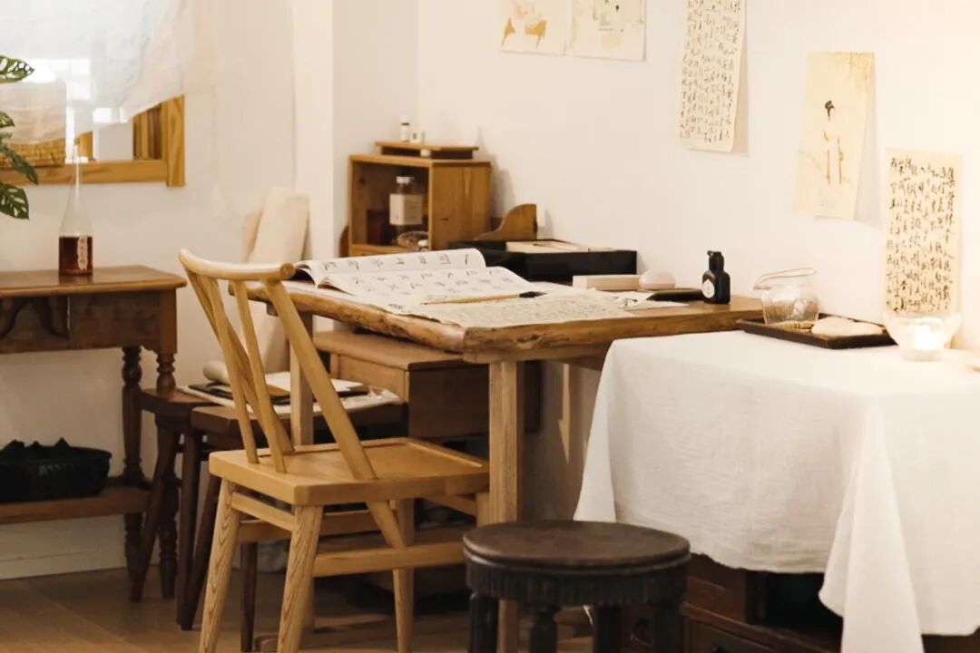 ▲桌子是乡下收来的老案板清洗打磨做成。整间屋子也没有窗帘,都是带着毛边的布来隔开,充满呼吸感