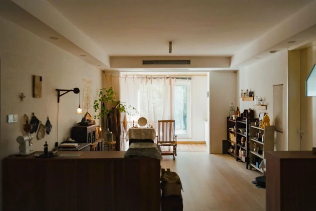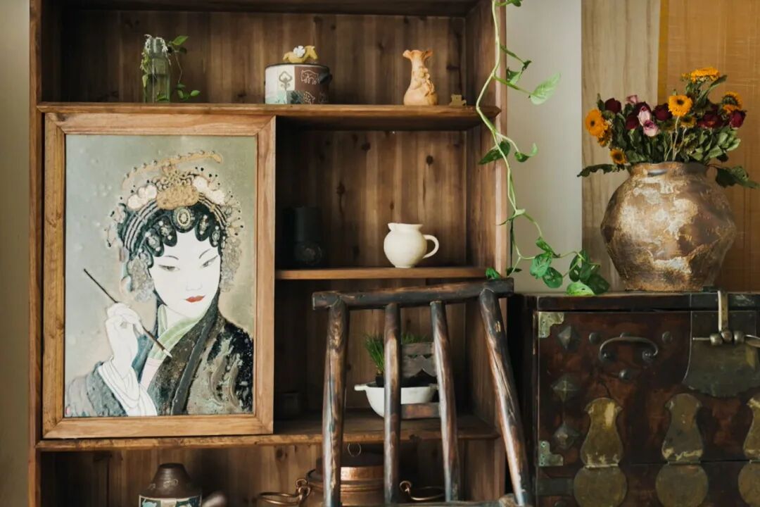 爸爸妈妈住的那个空间也很有意思。他们打掉了所有的非承重墙,好让阳光进来,显得整个屋子特别透气。整个家里几乎没有一件新家具,基本都是各地淘来的旧物。朝鲜李朝的铁柜、清末的美人图橱柜、少数民族的服装帽饰……当然,还有雷打不动的博古柜。