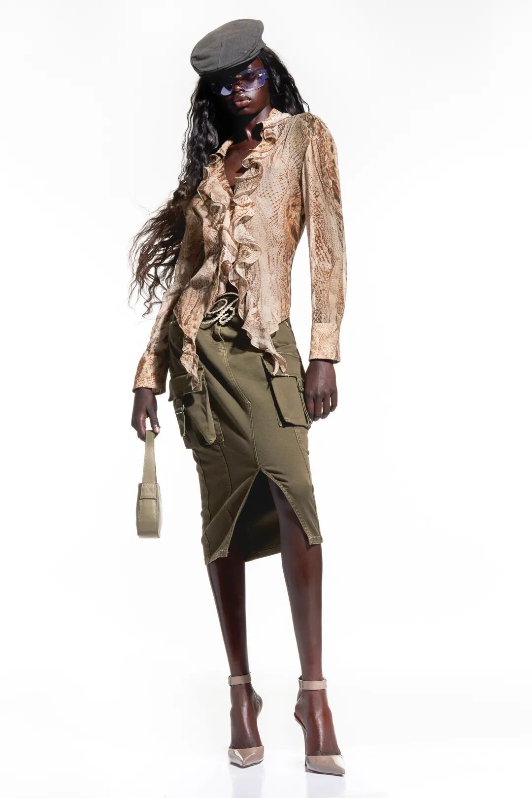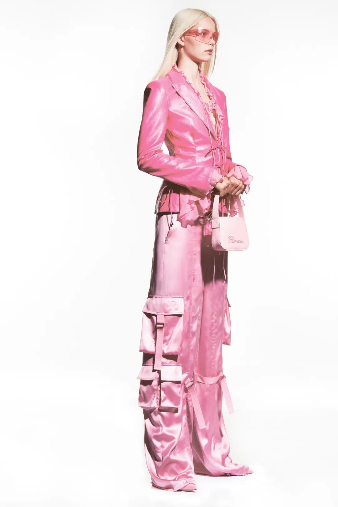 各种迭代的多口袋工装裤成为Blumarine表现功能性的一种方式,印有迷彩的图案,实际上是错视的玫瑰。