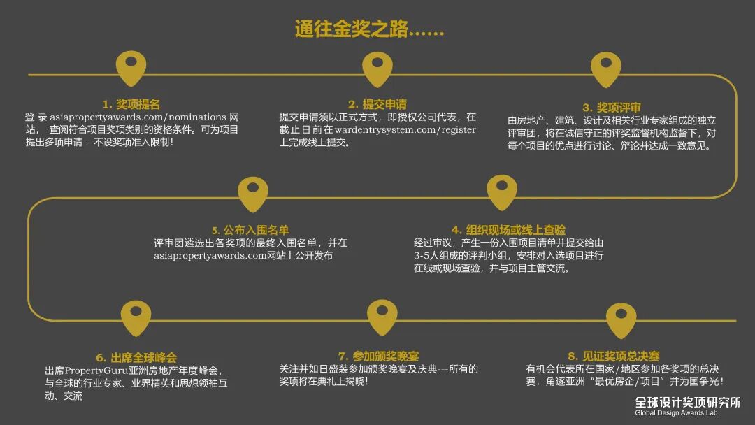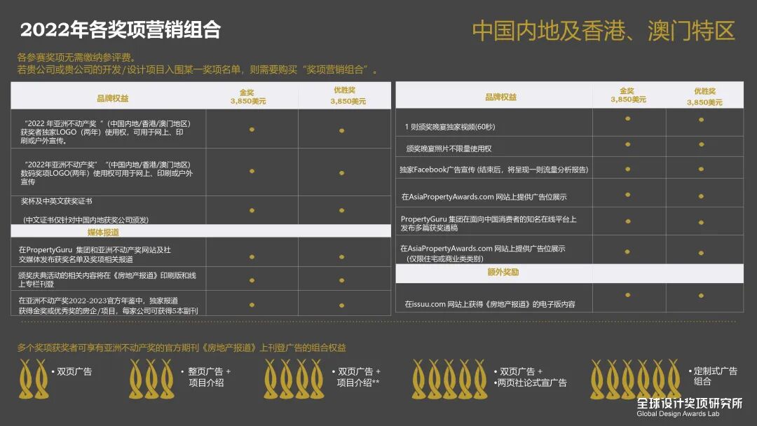 4、主要类别的金奖获得者,主办方将赠送两张入场券,邀请进入“亚洲不动产奖”亚太区的总决赛评选,亲临曼谷颁奖典礼现场;(若获得亚太区奖项,可选择性购买市场营销的套餐及LOGO使用权);