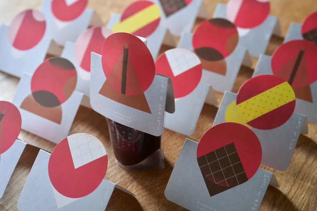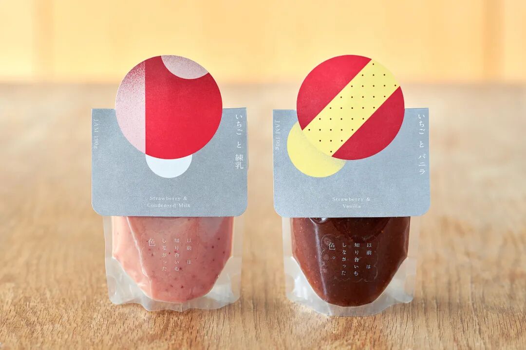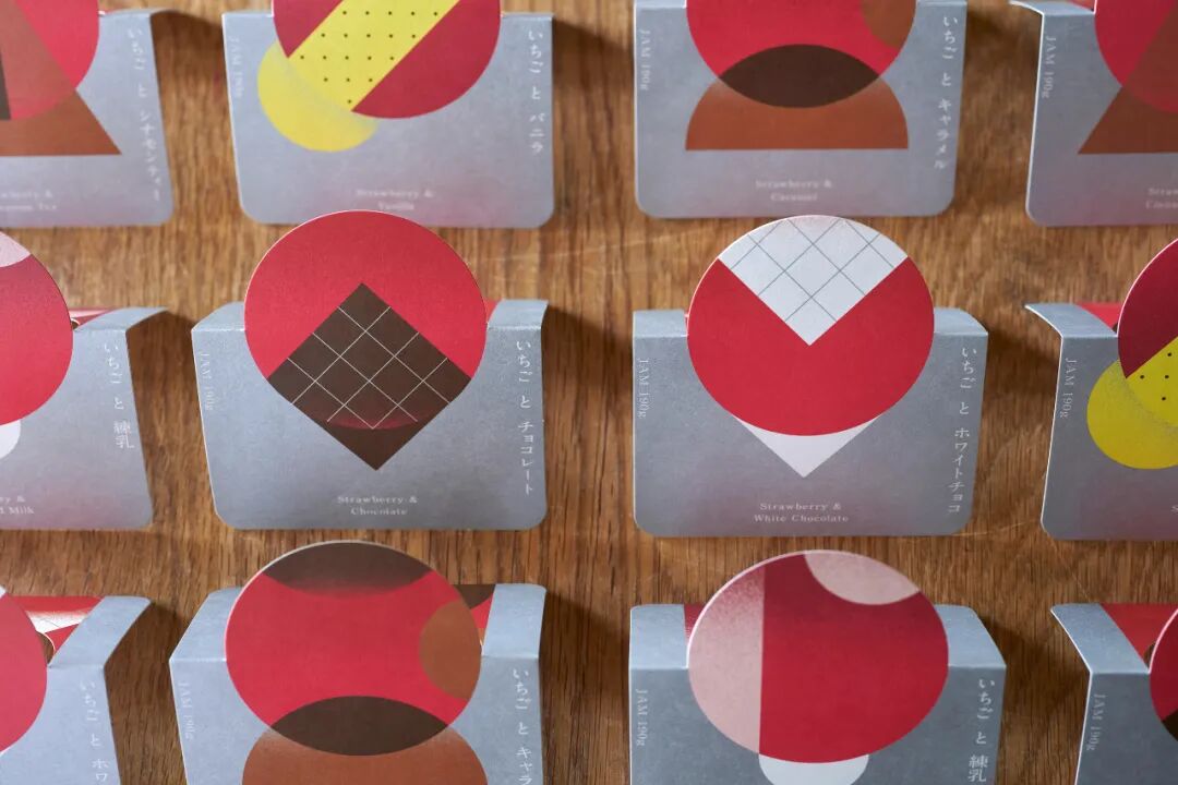 设计讲解:草莓酱的设计始于富山的草莓农场。他们开发了一种有六种不同口味的果酱:炼乳、香草、焦糖、肉桂茶、巧克力和白巧克力。由于所有这些都是基于草莓的,所以设计了每种口味的图形表示,以便一目了然地看到六种口味之间的差异。