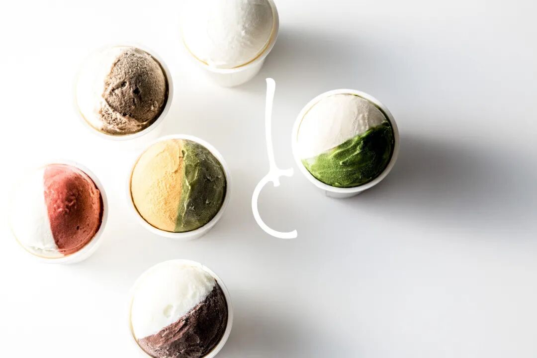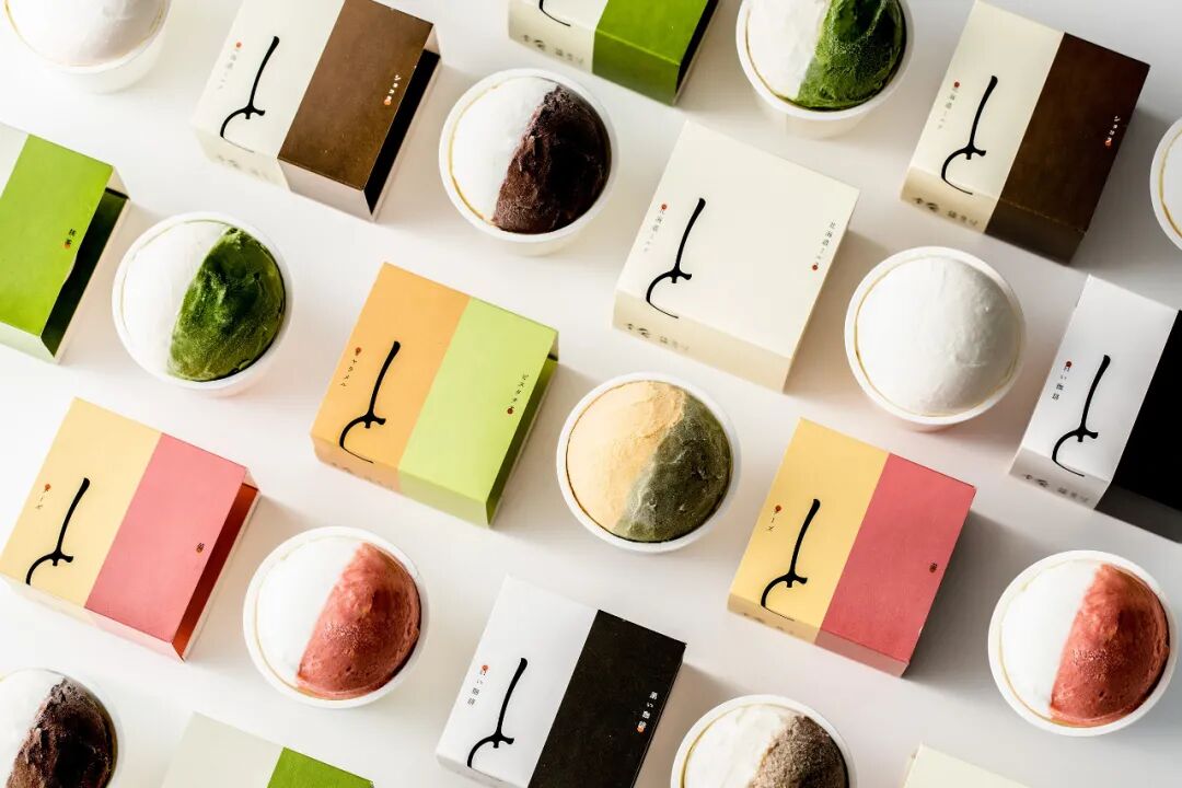 为了向消费者传达“融合两种口味的冰淇淋”的产品理念,包装设计分为两种颜色。“TO(and)”的排版,一个连接单词的助词,被用作符号来表达两种颜色的冰淇淋组合的形象。尽可能少的元素的简单布局使得“草莓和奶酪”、“开心果和焦糖”、“抹茶和和三盆”等产品名称很容易识别。