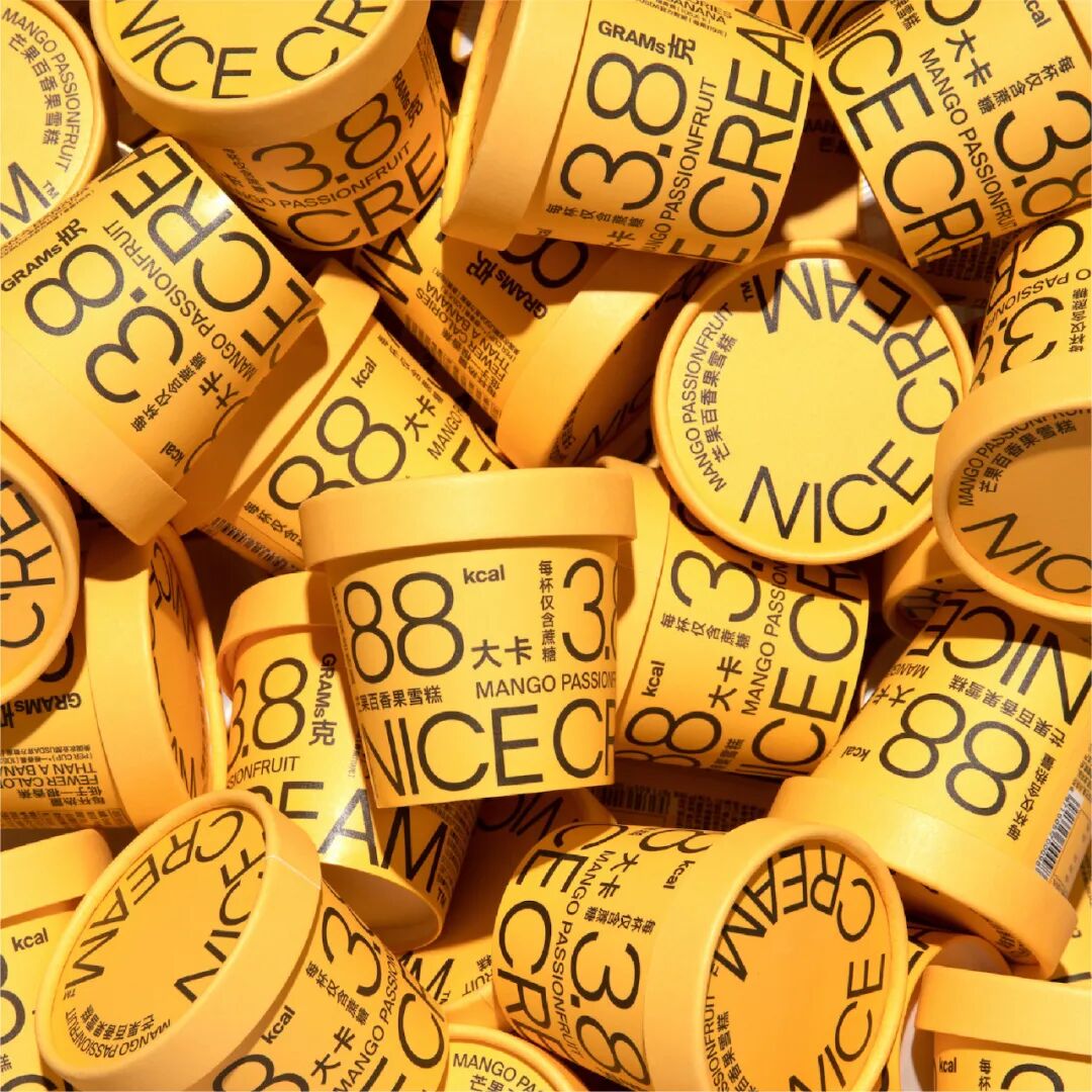 设计讲解:2019年初为NICE CREAM低热量健康冰淇淋设计logo、品牌、包装。尝试重新审视食品行业常规使用图片的设计风格,为食品行业注入活力。包装的设计捕捉健康食品使用者的习惯,突出营养元素,通过信息层次的重组和鲜艳的色彩塑造新一代冰淇淋品牌。
