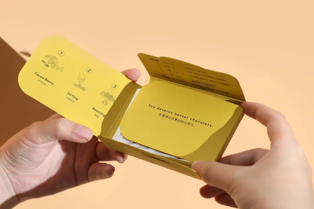 巧克力盒的灵感来源于文件盒的结构。每块巧克力在文件盒结构的包装盒内都有一张专属的风味卡片,卡片布局遵循基本网格系统的标准。打开MINI文件盒,你会看到盒子里面印着一句话“你值得拥有这种更好的巧克力”,通过“FROM BEAN TO BAR CHOCOLAT”里面的插图,你也会很快知道一块优质巧克力是如何制成的。