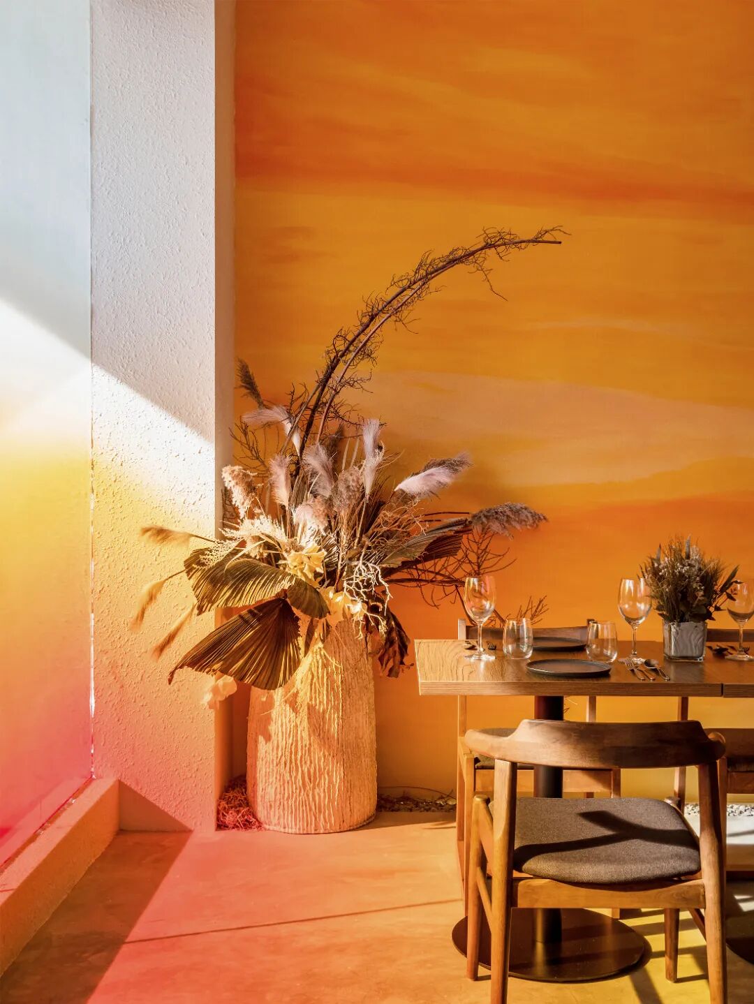 为与石墙相呼应,设计师特设了日落壁画作为餐厅的背景墙,随着日落背景的映入,在温柔的落日氛围中,与三五好友齐聚一堂,共享美食,共话愿景,愿时间定格在这一时刻,日落永不结束。